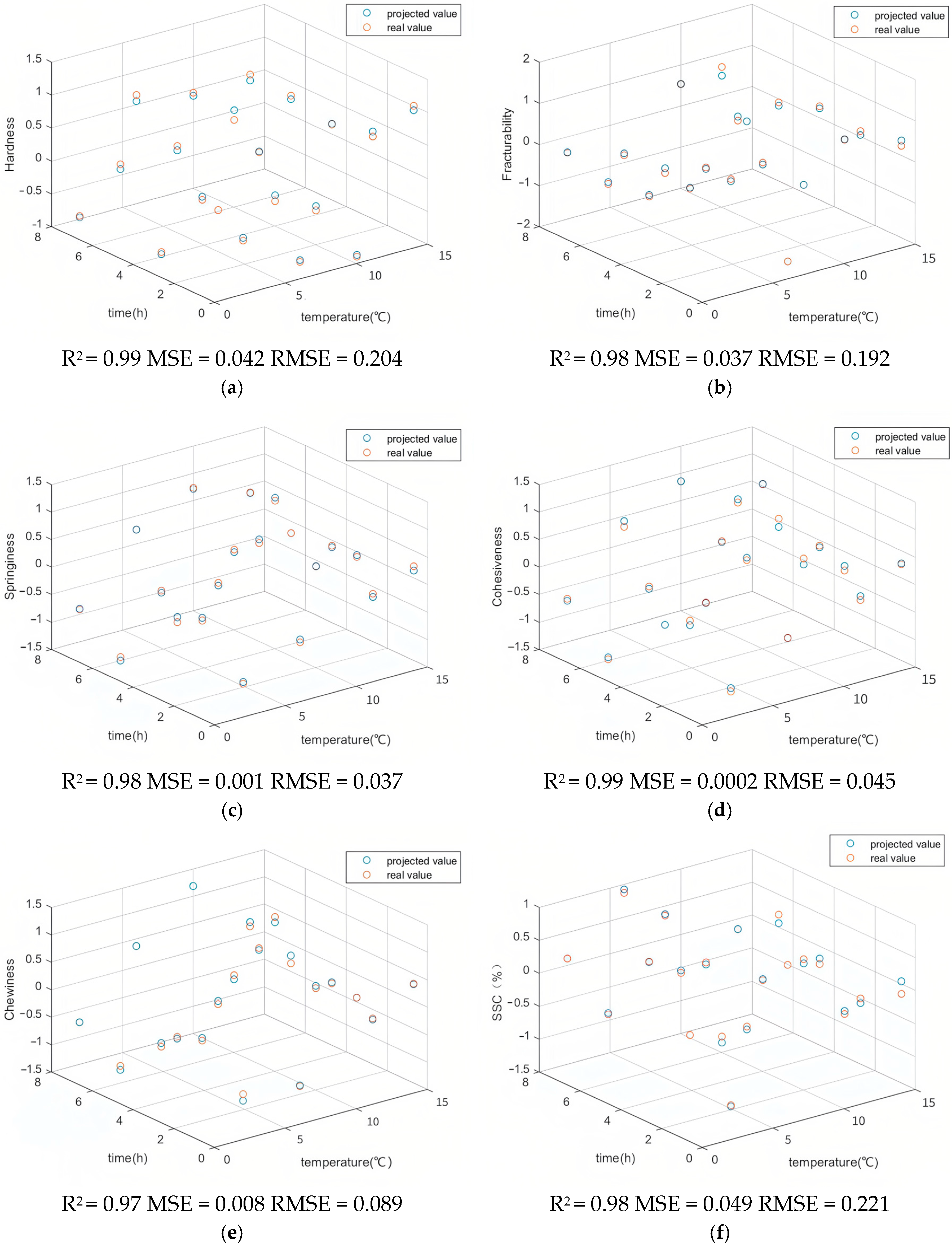 Table 6, analyzed through error values and significance tests, reveal that changes in texture and chemical properties exhibit clear patterns over time rather than random fluctuations. For instance, adhesiveness and resilience show distinct V-shaped trends, while other parameters such as springiness demonstrate more complex multi-stage variations. This systematic change provides objective evidence for interpreting the phased characteristics of quality alterations during storage.