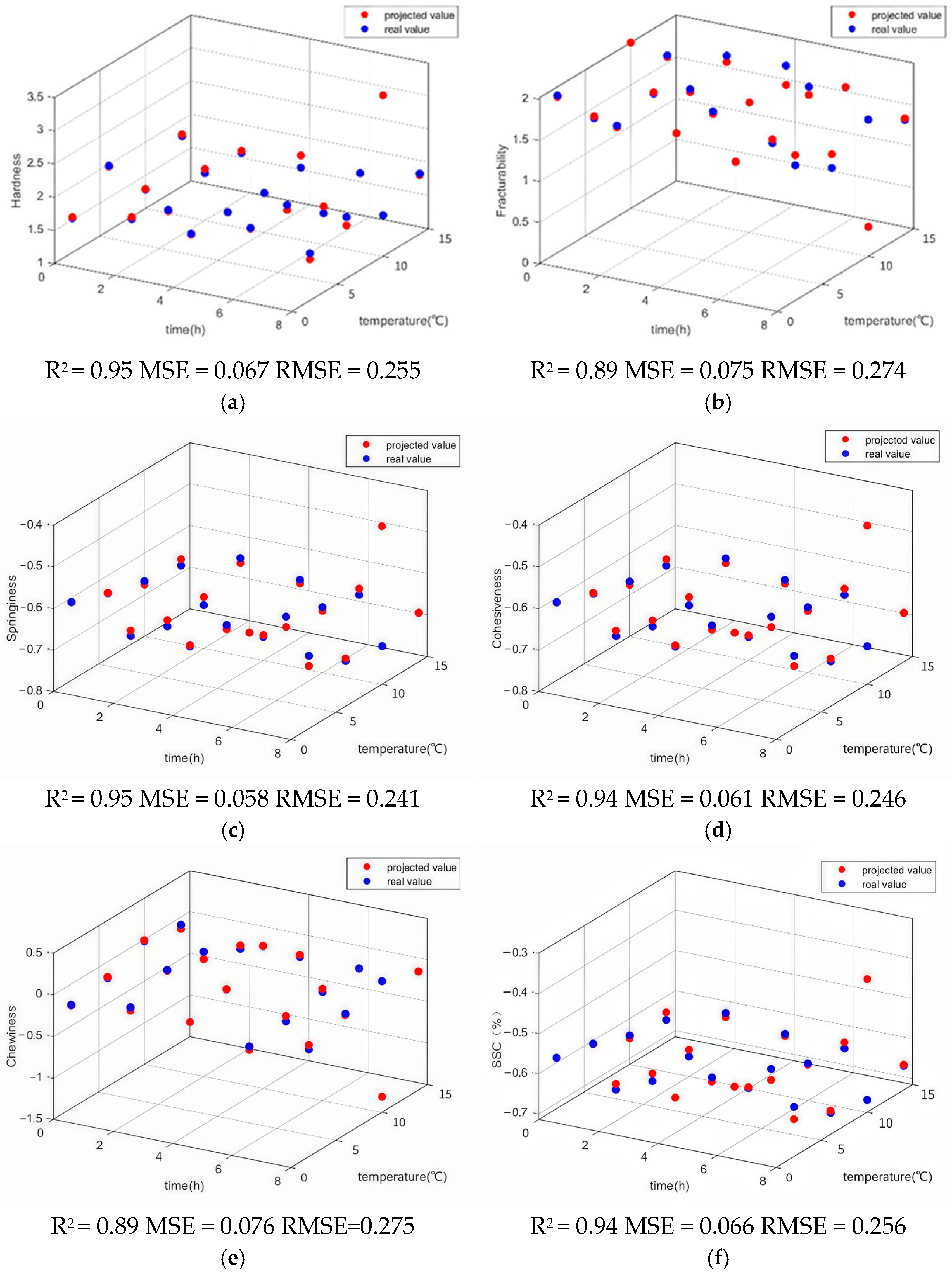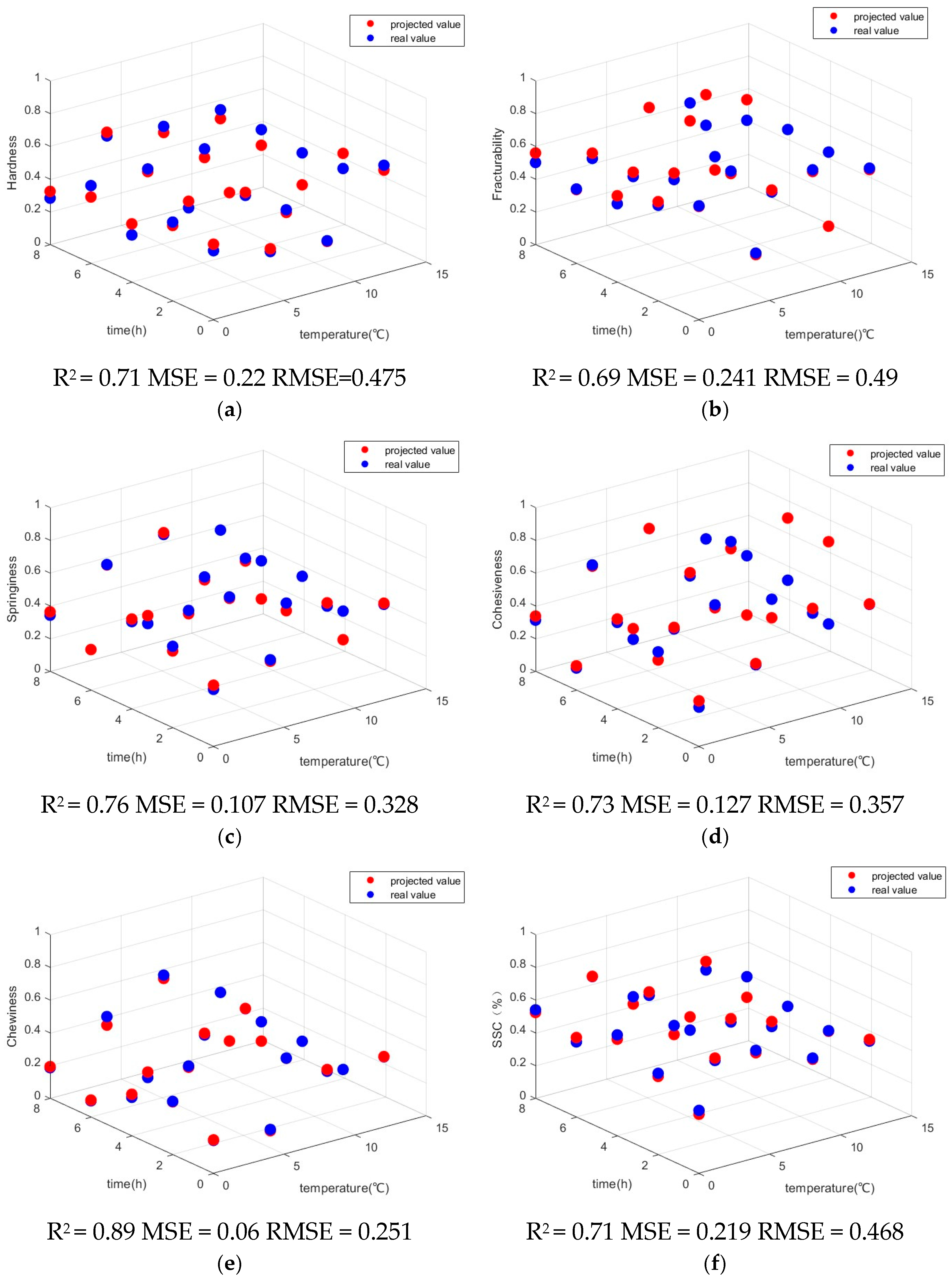 The predicted values and actual values of fresh goji berry by the neural network. (a) Correlation coefficients and mean squared errors for goji berry hardness; (b) correlation coeffi-cients and mean squared errors for goji berry fracturability; (c) correlation coefficients and mean squared errors for goji berry springiness; (d) correlation coefficients and mean squared errors for goji berry cohesiveness; (e) correlation coefficients and mean squared errors for goji berry chewiness; (f) correlation coefficients and mean squared errors for goji berry SSC.