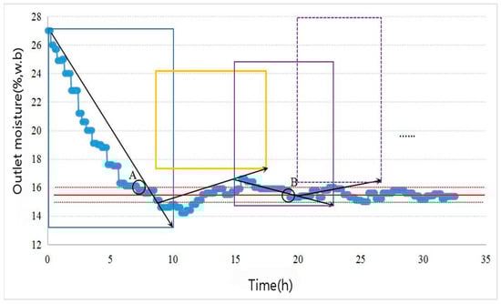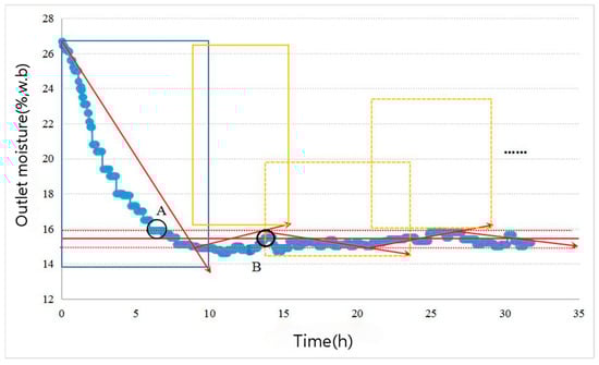 Outlet moisture variation curve for experiment 2. Blue curve, actual outlet moisture; red horizontal solid line, target outlet moisture (15.50%); two red dotted lines, system allowable error range (15.50 ± 0.50%); yellow window, water potential accumulation control window; solid-line window, window area changed compared with the previous; dashed-line window, aspect ratio adjusted while keeping the previous window area unchanged; point A, the first time the outlet moisture reached 15.50 ± 0.50%; point B, the first moment the outlet moisture reached 15.50 ± 0.50% after the system stabilized.