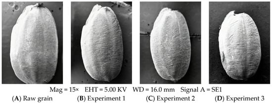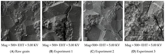 In Figure 9, the outer surface of raw grains was tight and smooth. Grains from experiments 1 and 3 exhibited more transverse wrinkles than those from experiment 2. After grain drying, significant temperature differences existed between the interior and exterior, leading to rapid and uneven moisture loss. Differences in moisture migration rates across the pericarp, seed coat, and endosperm, along with variations in expansion and contraction rates, collectively resulted in the formation of transverse wrinkles on the surface, which was consistent with the observations of Huang et al. []. In experiment 2, due to the small temperature difference between the interior and exterior in the initial stage of drying, the moisture gradient inside grains was smaller than that in experiments 1 and 3, resulting in more uniform water loss and fewer transverse stripes on the surface [].