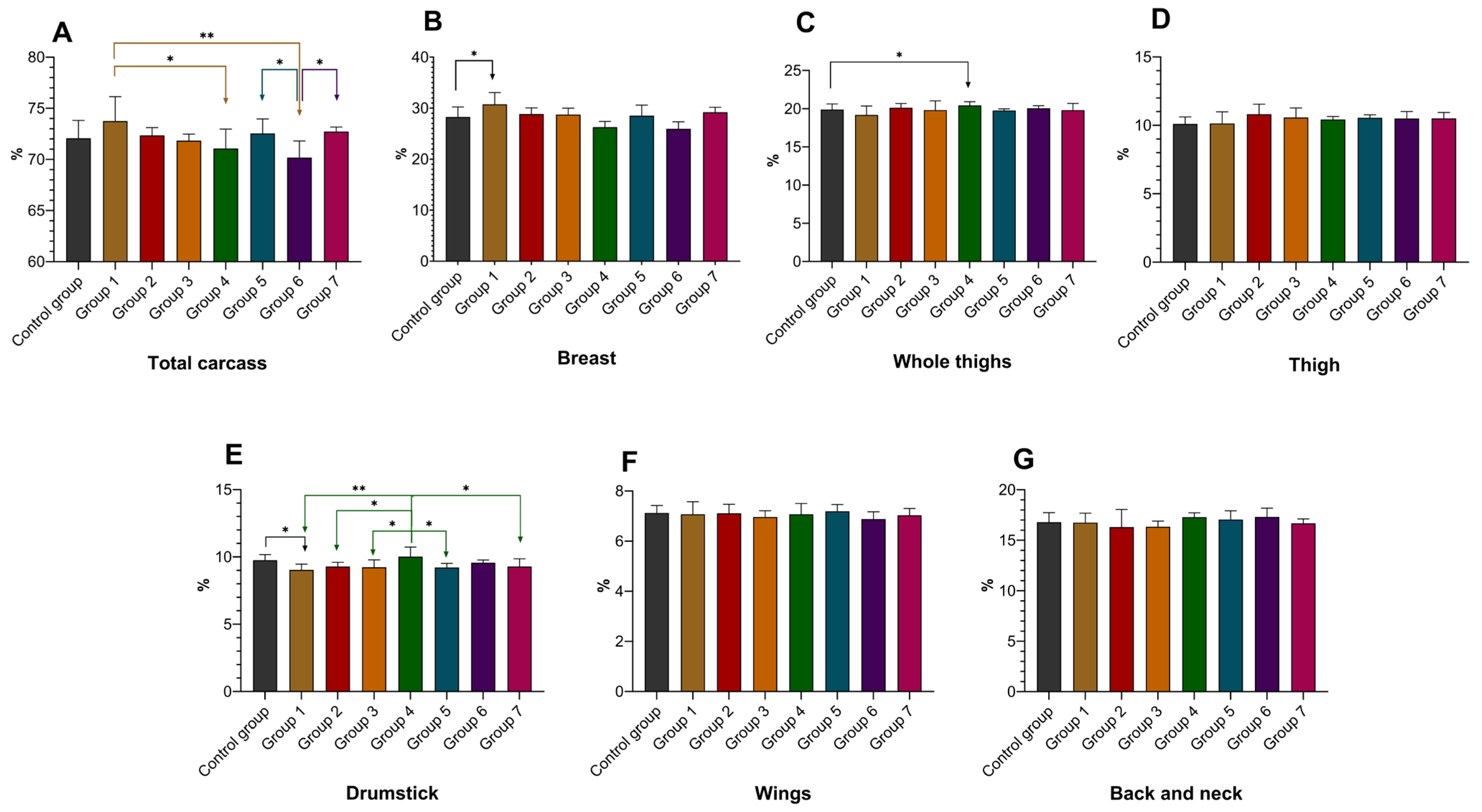 The dietary inclusion of TTEO in group G1 led to significant carcass portion differences when compared to G4 (Figure 2A) (p ≤ 0.05). Secondly, regarding breast portion (Figure 2B), significant differences were identified between the CG and G1 (p ≤ 0.05), being prominently increased in G1. Significant differences were also observed for G2 vs. G4, G2 vs. G6, G3 vs. G4, G3 vs. G6, and G5 vs. G6 (p ≤ 0.05), indicating treatment-dependent variation in breast portion.