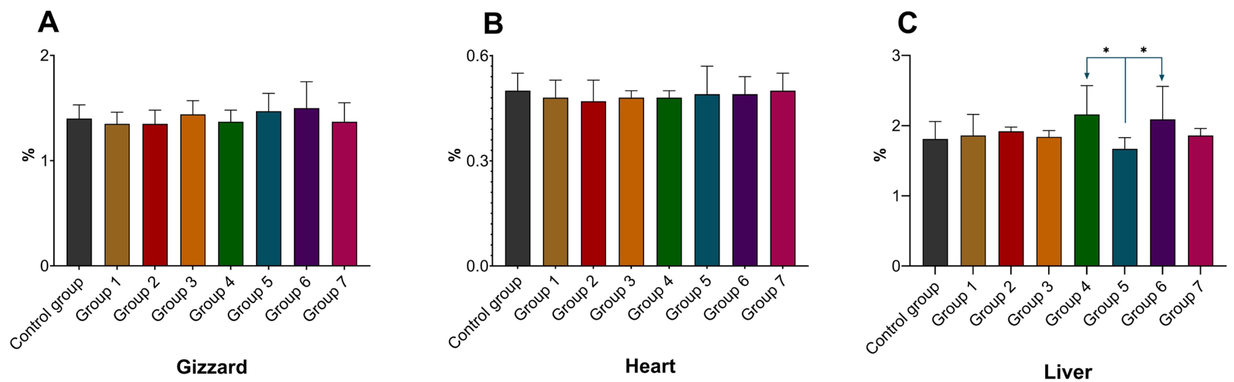 After analysing the whole thighs (Figure 2C), the highest portion was recorded in group G4, which was significantly higher compared to group G1 (p ≤ 0.05). However, for thigh portion specifically, no significant differences were observed among experimental groups (p ≥ 0.05) (Figure 2D). Analysis of drumsticks revealed a significant difference between G4 and G1 (Figure 2C, p ≤ 0.05), reflecting the influence of the treatments on this carcass component. At the same time, drumstick portion (Figure 2E) exhibited the lowest percentage in group G1, with significant differences observed between control vs. G1 and G1 vs. G4 (p ≤ 0.05). In the case of wings (Figure 2F), as well as back and neck portion (Figure 2G), no statistically significant differences were noted among experimental groups (p ≥ 0.05). Conclusively, Group G1 demonstrated the highest breast portion and the lowest whole-thigh portion among the experimental groups. In the case of internal organs (Figure 3), significant differences were identified only for liver portion (Figure 3C), where the highest portion was recorded in group G4 and the lowest in group G5, with statistical significance between these two groups (p ≤ 0.05). No significant differences were identified for gizzards and hearts.