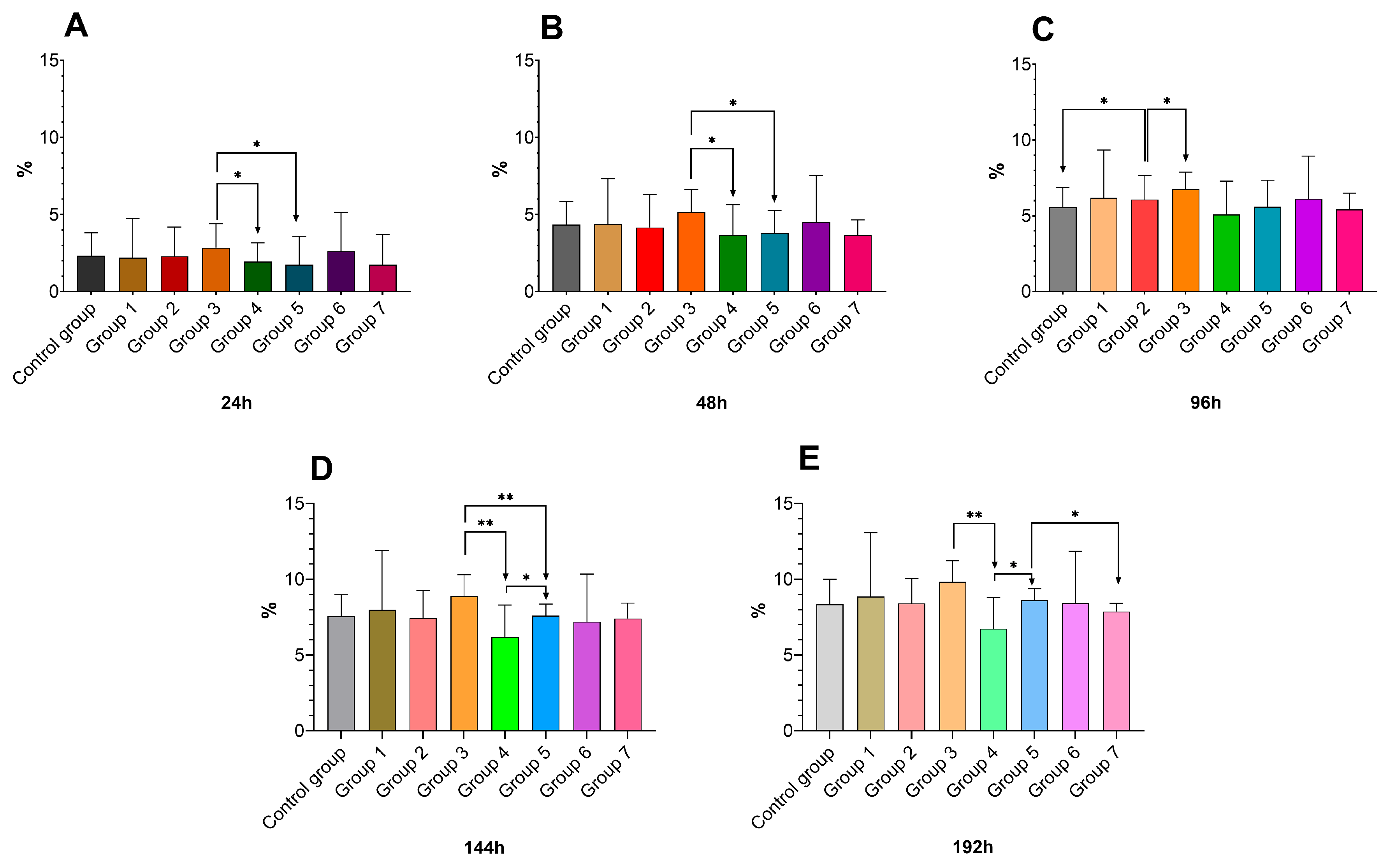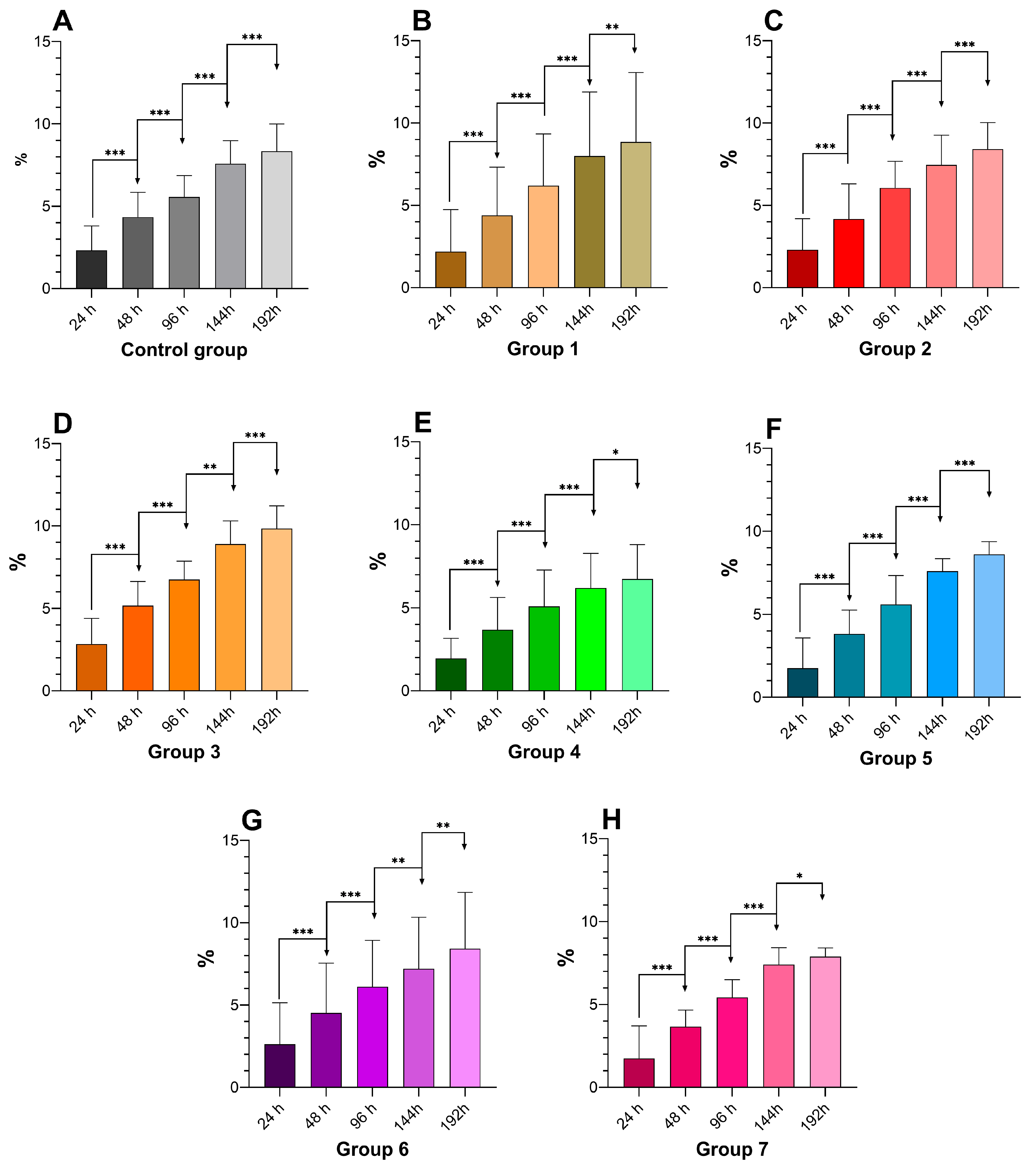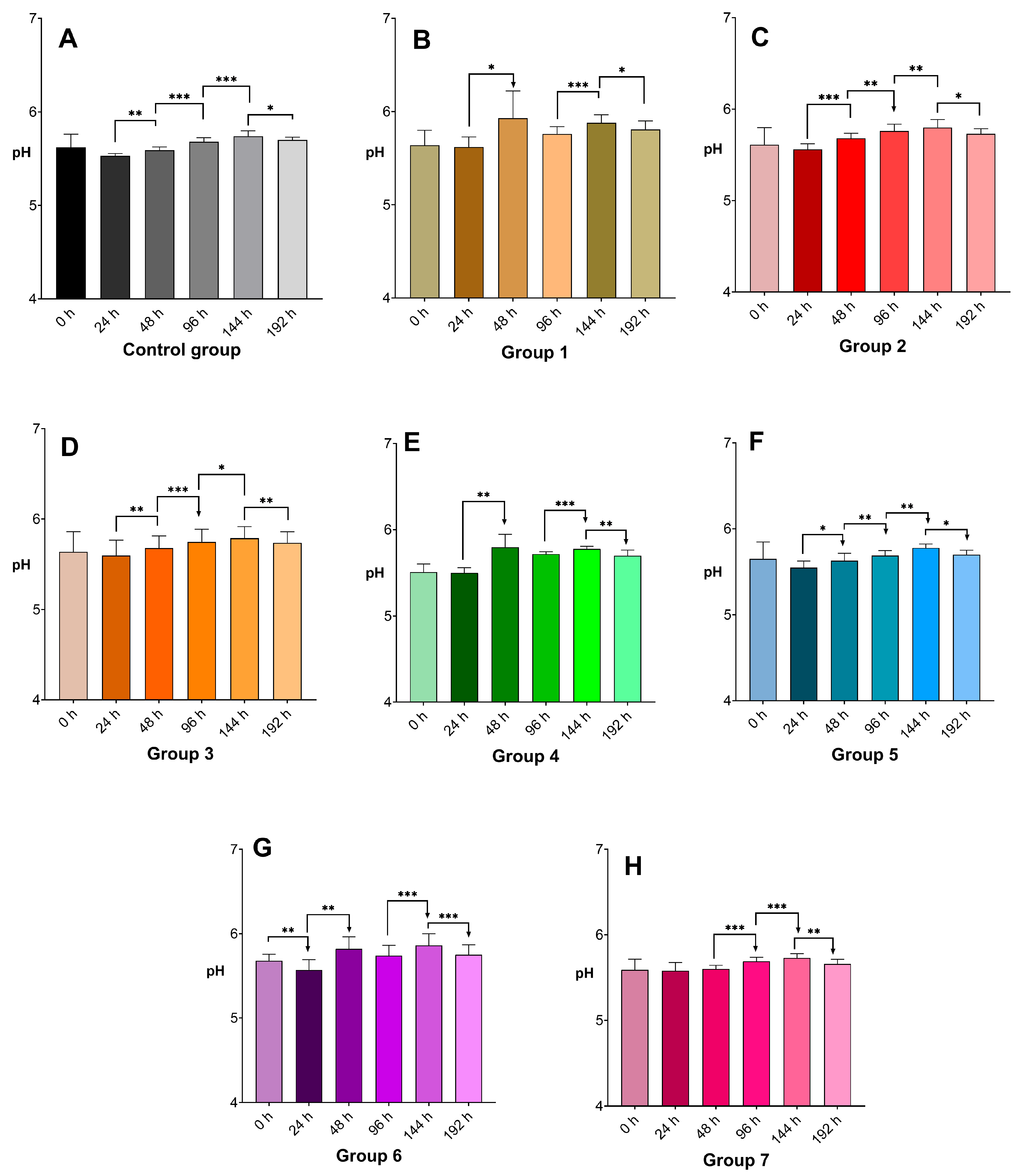 Regarding group G6, a significant difference was observed between the pH values measured immediately after sample collection (0 h) and those measured 24 h post-collection (Figure 7G). Furthermore, between 24 and 48 h after sample collection, we identified an increase in pH across all experimental groups, with statistically significant differences (p ≤ 0.05), except for group G7, for which the differences were not significant (p ≥ 0.05) (Figure 7A–G). A continuous increase in pH (Figure 7A,C,D,F,H) was also observed from 48 to 96 h post-sampling, with significant differences explicitly observed in groups CG, G2, G3, G5, and G7 (p ≤ 0.05). This trend of increasing pH persisted even between 96 to 144 h and again between 144 to 192 h post-sampling, respectively, with statistically influential dissimilarities noted for all experimental (Figure 7A–H) groups (p ≤ 0.05).