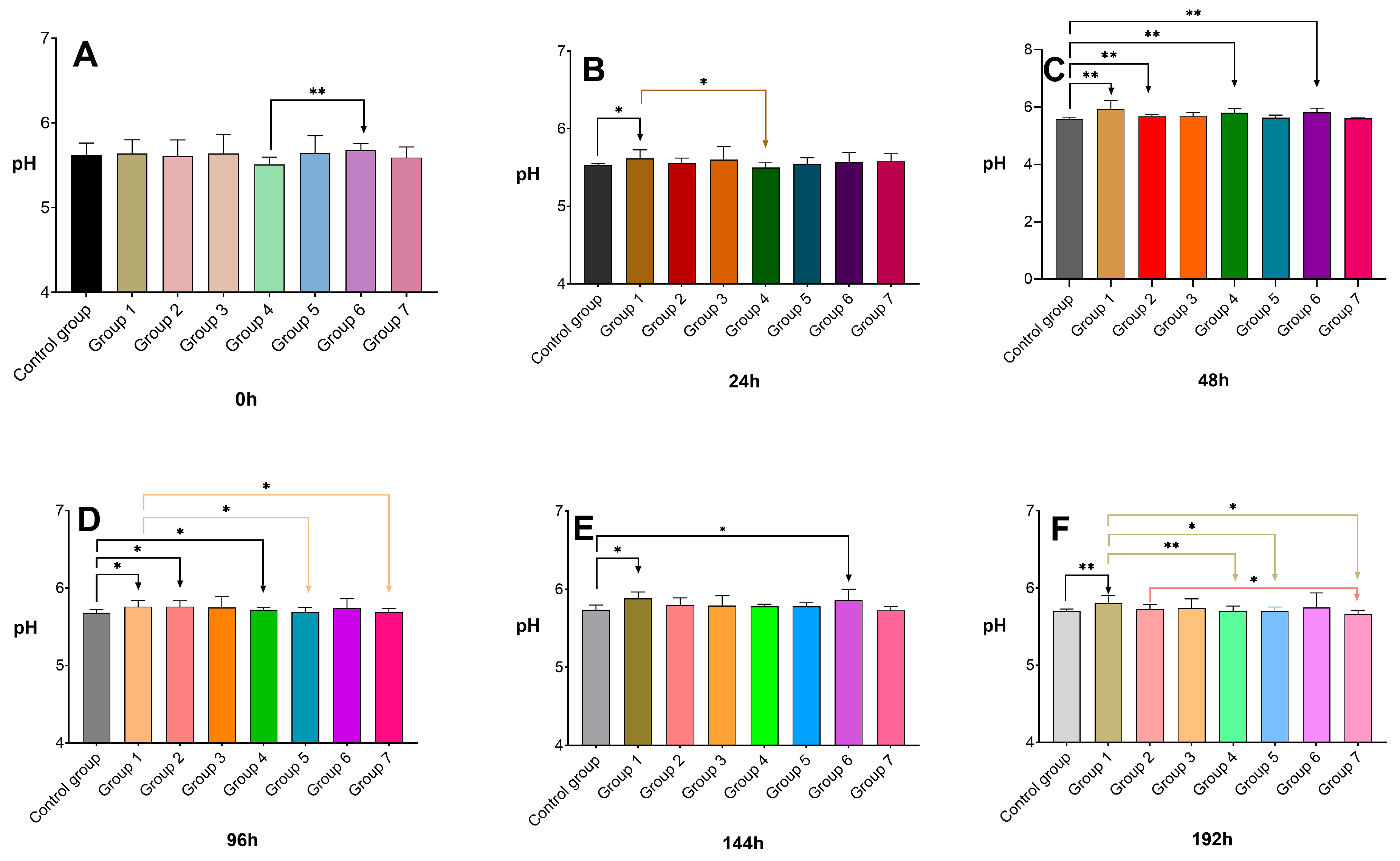 At 0 h post-sampling, significant differences (p ≤ 0.05) were observed between groups G4 and G6. At 24 h post-sampling, significant differences (p ≤ 0.05) were observed between groups CG and G1, as well as between G1 and G4, with group G4 having the lowest pH value (Figure 6B). At 48 h, statistical differences (p ≤ 0.05) were identified between several groups, including CG vs. G1, CG vs. G2, CG vs. G4, and CG vs. G6 (Figure 6C). Additional significant differences were found between G1 and G2, G1 and G3, G1 and G5, G1 and G7, G2 and G6, G2 and G7, G4 and G6, G5 and G6, and G6 and G7 (p ≤ 0.05). Also, at 48 h, the lowest pH value was recorded in CG, while the highest was observed in G1. After 96 h, significant pH differences were observed between groups CG vs. G1, CG vs. G2, CG vs. G4, and G2 vs. G5 (p ≤ 0.05) (Figure 6D). At 144 h post-sampling, significant differences were evident among groups CG vs. G1, CG vs. G6, G1 vs. G4, G1 vs. G5, G1 vs. G7, G4 vs. G7, G5 vs. G7, and G6 vs. G7 (p ≤ 0.05) (Figure 6E). Some significant pH differences persisted even after 192 h, specifically between the following groups: CG vs. G1, G1 vs. G4, G1 vs. G5, G1 vs. G7, and G2 vs. G7 (p ≤ 0.05) (Figure 6F). Finally, the lowest pH value was recorded in G7, while the highest pH was observed in G1.