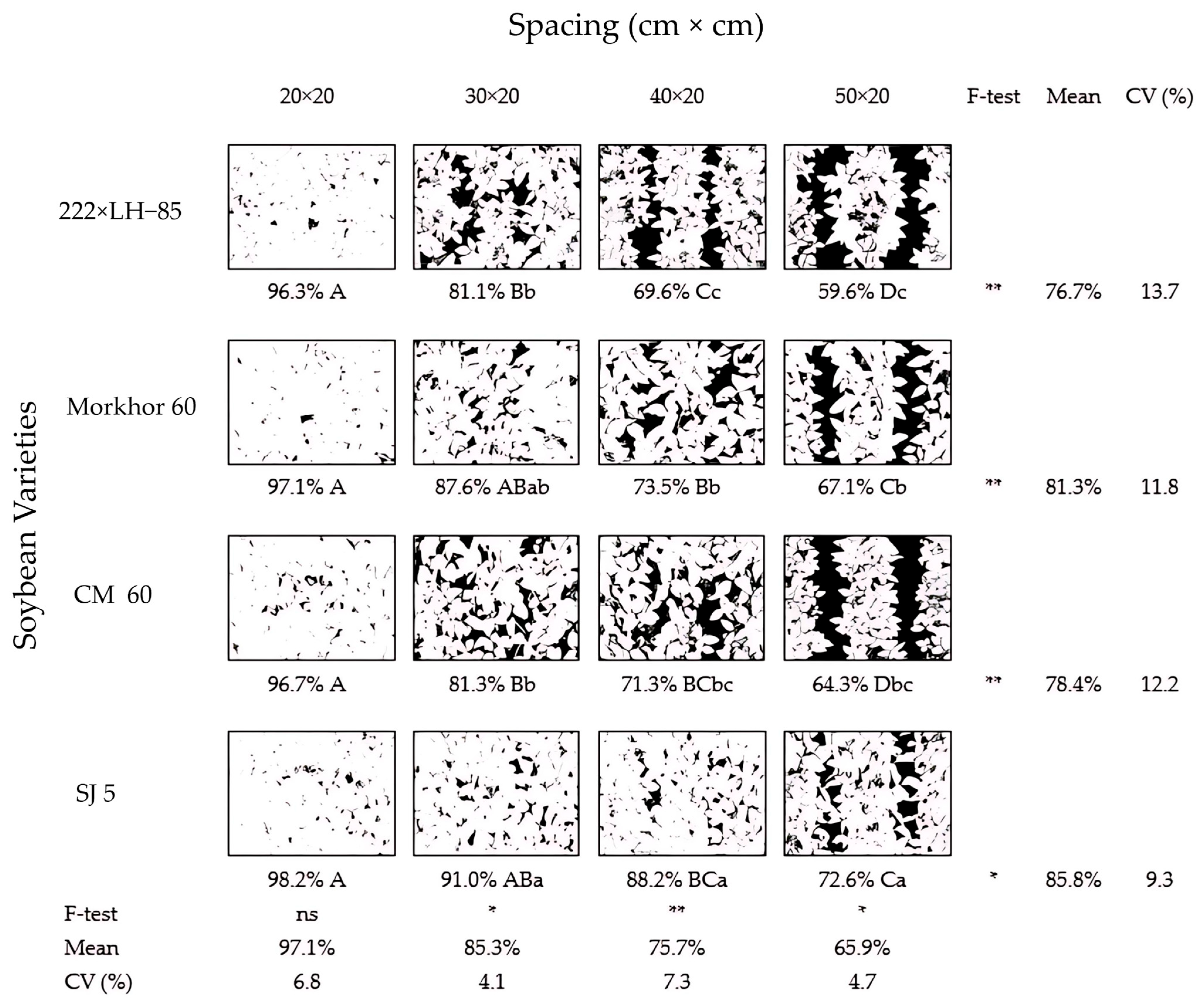 | Spacing (B) | ** | ** | ** | ** | ** | ** | ns | ns | |