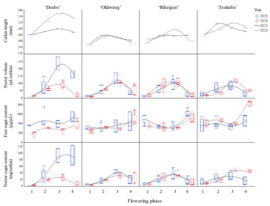 Variation in catkin length (mm), nectar volume (µL/catkin), free sugar content (µg/µL), and nectar sugar content (mg/catkin) of four chestnut cultivars (‘Daebo’, ‘Okkwang’, ‘Riheiguri’, and ‘Tsukuba’) across four flowering phases in 2023 and 2024. Boxes denote median and IQR; whiskers = 1.5 × IQR; markers show means ± SD. Curves are loess smoothers by year (solid = 2023, dashed = 2024). Error bars indicate standard deviation.