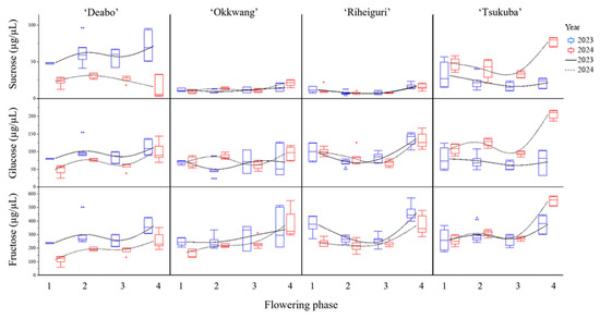Sucrose and glucose in floral nectar generally increased toward phase 4. Fructose showed late-phase increases that were similar or steeper depending on the combination of cultivar and year (Figure 3). In 2023, ‘Daebo’ showed the highest sucrose in phase 4 (71.27 ± 18.84 µg/µL). In the same year, ‘Riheiguri’ recorded the highest glucose and fructose in phase 4 (136.46 ± 32.78 and 456.97 ± 94.72 µg/µL, respectively). In 2024, ‘Tsukuba’ recorded four maxima across all three sugars (sucrose 77.36 ± 5.98; glucose 206.33 ± 12.10; fructose 549.55 ± 34.16 µg/µL).