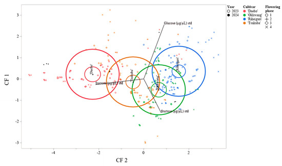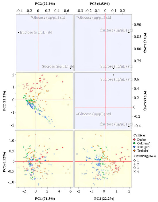 In the PC1 versus PC2 plane, cultivar positions followed these loading patterns. ‘Tsukuba’ at phase 4 was positioned at high PC1 and negative PC2, which corresponds to nectar with high total sugar and a hexose-rich balance. ‘Daebo’ extended toward high PC1 and positive PC2, which corresponds to high total sugar with a larger sucrose share. ‘Okkwang’ clustered near the origin or slightly negative on both axes, and ‘Riheiguri’ shifted toward negative values on both axes.