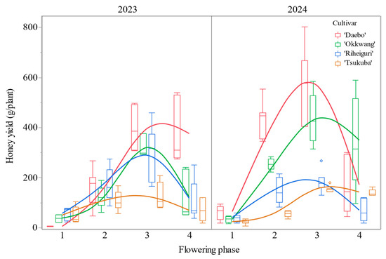 Estimated honey yield (g/plant) by cultivar and flowering phase in 2023 and 2024 (all p < 0.001). Values are presented as mean ± standard deviation.