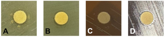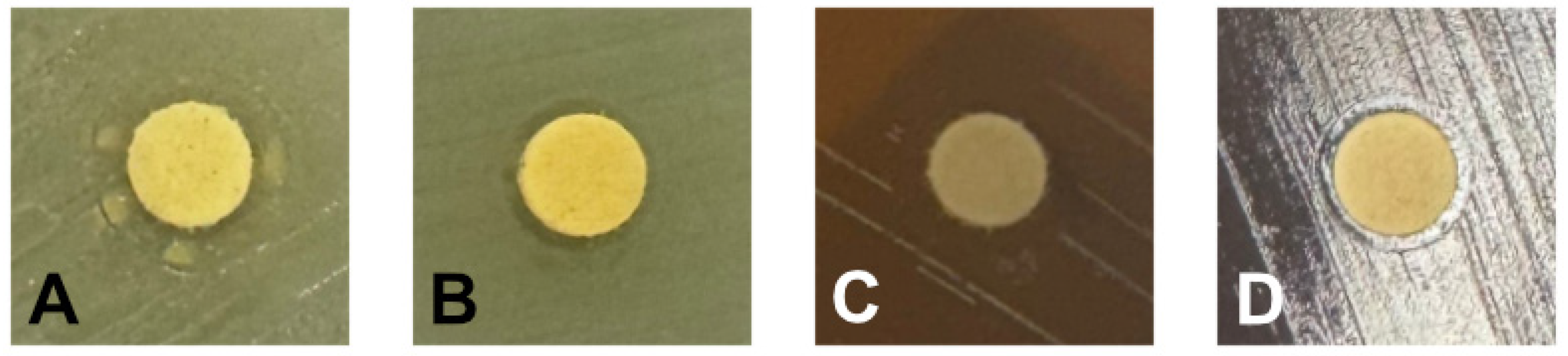 Disk-diffusion assays with 3% (w/v) morin against (A) S. aureus, (B) E. coli ATCC 25848, (C) L. monocytogenes ATCC 13932, and (D) Streptococcus spp. Clear inhibition zones are visible around morin disks. Results for 1% and 2% concentrations are provided in Supplementary Figure S1.