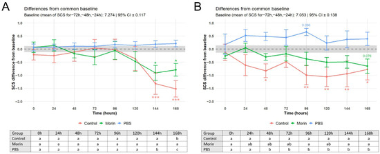 Changes in SCS over time relative to baseline (dotted line) in cows treated with 3% morin (Morin; IMM), IMM antibiotic (Control), or phosphate-buffered saline (PBS; IMM) for mastitis caused by (A) E. coli and (B) S. uberis. Asterixis denotes FDR-adjusted post hoc differences within-group vs. common baseline: * p < 0.05; ** p < 0.01; *** p < 0.001; numerical values denote trend p-values (0.05 < p < 0.1). The baseline 95% CI is shaded gray. Values are mean ± SEM. Inset tables summarize between-group differences at each time point; within a column (time point), groups sharing the same letter do not differ significantly (FDR-adjusted p > 0.05).