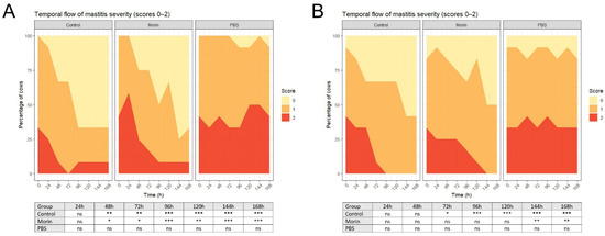 Temporal distribution of mastitis severity scores (0–2) over the study period for mastitis caused by (A) E. coli and (B) S. uberis. Panels show Control (antibiotic), Morin (3% IMM), and PBS (IMM) groups; stacked areas represent the proportion of cows at each score at each time point. Inset tables summarize within-group changes versus corresponding baseline at time 0 h (FDR-adjusted): * p < 0.05; ** p < 0.01; *** p < 0.001; ns—non-significant (p > 0.05).