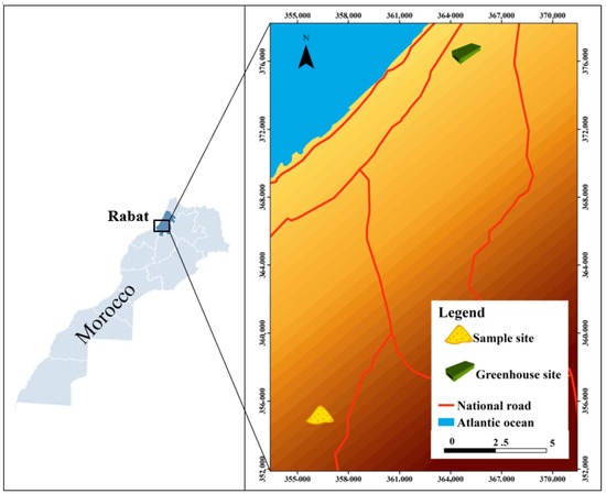 This study was carried out at the Regional Center of Rabat of the National Institute of Agricultural Research (INRA), within the Research Unit for Environment and Natural Resource Conservation (URECRN). The experiment was conducted in a greenhouse at this center, located at 34°03′50″ N latitude and 06°50′40″ W longitude, approximately 70 m above sea level, representing the typical coastal area of Rabat. Soil samples were manually collected from an agricultural field in the Temara region (latitude 33°53′29.6″ N, longitude 6°56′15.8″ W; altitude 78.42 m), approximately 30 km south of Rabat. This field was selected for its fine-textured soils, which are particularly prone to salinization and degradation under irrigation. Samples were taken from the top 0–40 cm soil layer using an auger, as this layer represents the most biologically active and agriculturally important portion of the profile. Climate data for Témara were obtained from the local meteorological station. Minimum and maximum temperatures, precipitation, humidity, and rainy days cover the period 1991–2021, while average sunshine hours are available for 1999–2019 [43]. The region has a Mediterranean climate with oceanic influences, characterized by mild, wet winters (January minimum 8.2 °C, maximum 16.8 °C, 69 mm rainfall, 6 rainy days) and warm, dry summers (July minimum 18.3 °C, maximum 30.3 °C, 1 mm rainfall, 0 rainy days). Monthly average temperatures range from 12 °C (January) to 24.2 °C (August), relative humidity varies between 67% and 79%, average annual rainfall is around 451 mm, and average annual sunshine is approximately 9.2 h/day. These data provide a precise and location-specific climatic context for the experimental and soil sampling sites (Figure 1).