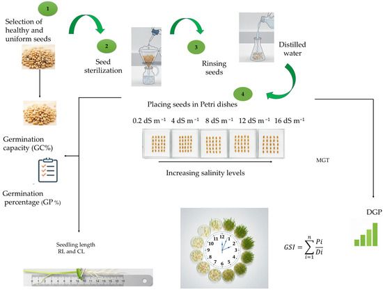 Seed germination is the earliest and most vulnerable stage in the plant life cycle, critically influencing crop establishment and yield potential. This stage is particularly sensitive to salinity, which imposes osmotic stress, limiting water uptake, and ionic stress, caused by excessive sodium (Na+) and chloride (Cl) ions [3,4,5,6,7,8,9,10,11,12,13,14,15,16,17,18,19,20,21,22,23,24,25,26]. These stresses disrupt physiological and biochemical processes, including nutrient absorption, photosynthesis [27], protein synthesis, and energy metabolism [28], while inducing oxidative damage through reactive oxygen species (ROS). As a result, germination can be delayed or inhibited, reducing seedling establishment and compromising subsequent growth. The severity of these effects varies with salinity level and varietal tolerance, with osmotic stress predominating at lower concentrations and ion toxicity at higher levels. Importantly, salinity continues to affect growth at later vegetative stages, further limiting biomass accumulation and overall crop productivity [29,30,31].