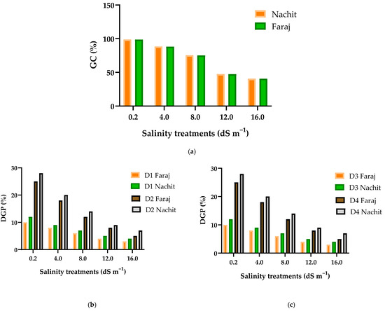 The germination and early seedling growth stages constitute crucial phases in the plant life cycle and are highly vulnerable to the quality of irrigation water, particularly its salinity. The impact of salt stress on durum wheat during these stages is reflected through several key indicators such as GP, DGP, GSI, MGT, RL, and CL. These early responses are influenced by both genetic predispositions and environmental cues, which together shape the seed’s capacity to initiate growth under optimal conditions. Elevated salinity often disrupts physiological balance, primarily due to ion toxicity and osmotic effects, which hinder water uptake and impair metabolic activity essential for germination and seedling development [50,51]. Salinity induces osmotic stress that restricts water uptake by seeds and causes ionic toxicity, primarily as a result of the high accumulation of Na+ and Cl ions. These conditions disrupt nutrient balance and interfere with essential metabolic processes such as germination, thereby reducing GP and GSI, and ultimately impairing seed vigor and early seedling development.