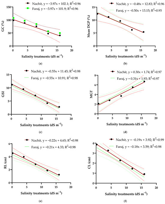 Linear regression analyses revealed strong relationships between salinity treatments and all measured germination and early seedling growth parameters (Figure 5). For both durum wheat varieties, germination capacity (GC) exhibited a strong negative correlation with salinity (R2 = 0.96 for Nachit and R2 = 0.96 for Faraj). Similarly, daily germination percentage (DGP) showed a pronounced negative relationship with salinity (R2 = 0.96 for Nachit and R2 = 0.95 for Faraj), indicating that increasing NaCl concentrations reduced both the speed and uniformity of germination. The germination speed index (GSI) also declined significantly with salinity (R2 = 0.98 for the two varieties). In contrast, mean germination time (MGT) was positively correlated with salinity (R2 = 0.97 for both varieties), reflecting a prolongation of the germination process at higher salt levels. Early seedling growth parameters, including root length (RL) (R2 = 0.98) and coleoptile length (CL) (R2 = 0.99 for Nachit and R2 = 0.98 for Faraj), were negatively affected by increasing salinity.