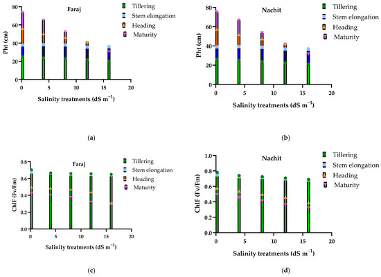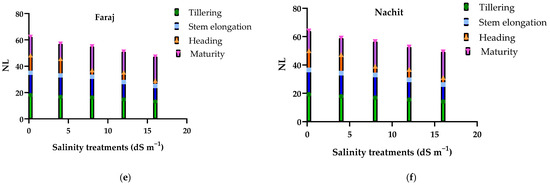 Figure 6 illustrates the effects of increasing salinity on plant height, chlorophyll fluorescence (Fv/Fm), and leaf number in durum wheat cultivated on silty clay soil across key vegetative and reproductive stages. Plant height showed little difference between tillering and stem elongation, even under moderate salinity (4–8 dS m−1), but progressively declined with higher NaCl concentrations, particularly at heading and maturity under severe salinity (16 dS m−1), reaching only 30–32 cm at maturity. Chlorophyll fluorescence (Fv/Fm) followed a similar pattern: slightly affected at early stages, but markedly reduced at heading and maturity, dropping below 0.32 under the highest salinity. Leaf number per plant also decreased with salinity, with reductions of approximately 25% at maturity compared to the control. Across all stages, Nachit consistently maintained slightly higher plant height, Fv/Fm, and leaf number than Faraj, indicating a marginally better tolerance to saline irrigation.