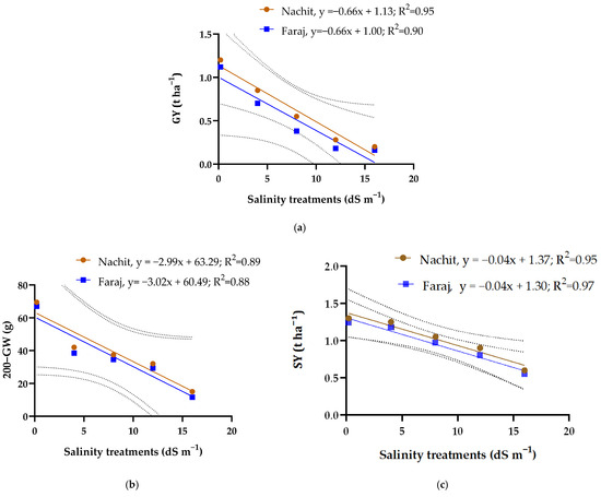 Across all salinity treatments, increasing salinity had a negative impact on the yield traits of durum wheat (Figure 7). Grain yield (GY) showed the strongest response to salinity, with R2 = 0.95 for Nachit and R2 = 0.90 for Faraj, indicating a very high sensitivity of productivity to NaCl stress. Straw yield (SY) also declined, with R2 = 0.95 for Nachit and R2 = 0.97 for Faraj, reflecting a substantial reduction in vegetative biomass under elevated salinity. Similarly, 200-grain weight (200-GW) was strongly affected, with R2 = 0.89 for Nachit and R2 = 0.88 for Faraj, demonstrating that grain filling and individual grain development are significantly impaired at higher salt levels. All correlations were negative, confirming the inverse relationship between salinity and these yield components.