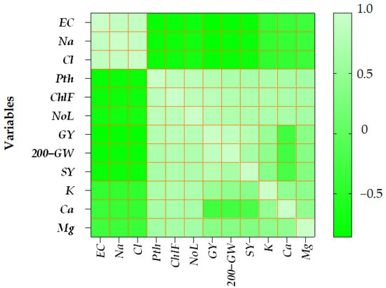 The heatmap of correlations among soil parameters, growth traits, and yield. components in durum wheat under increasing salinity levels (Figure 8) highlighted distinct relationships between the measured variables. EC, Na, and Cl were strongly and positively correlated with each other, while exhibiting significant negative correlations with plant height (Pth), chlorophyll fluorescence (ChlF), number of leaves (NoL), grain yield (GY), 200-grain weight (200-GW), and straw yield (SY). Among yield components, GY and 200-GW displayed a strong positive correlation, and a moderate positive correlation was observed between 200-GW and SY. Potassium (K) was positively and strongly correlated with growth traits (Pth, ChlF, NoL) across all salinity levels, whereas its correlations with yield components were weakly positive. Similarly, calcium (Ca) exhibited strong positive correlations with vegetative traits, while correlations with GY, 200-GW, and SY were slightly negative under higher salinity. Magnesium (Mg) showed moderate positive correlations with growth traits and weak positive correlations with GY and 200-GW. Growth traits themselves were consistently positively correlated with yield components, with ChlF exhibiting particularly strong positive correlations with Pth, NoL, and GY. Number of leaves (NoL) was positively correlated with GY, 200-GW, and SY, while plant height (Pth) was moderately positively associated with all yield components.