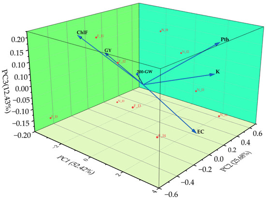 To ensure data suitability given the limited number of observations, six key variables were selected: EC, K, Pth, ChlF, GY, and 200-GW. PCA was applied as an exploratory multivariate tool to visualize associations and identify the most discriminating factors influencing plant performance under saline conditions. The first three principal components had eigenvalues ≥ 1 and together explained 90.53% of the total variation, ensuring a robust representation of the dataset. PC1 (52.42%) represented the performance and yield axis, being strongly and positively associated with Pth, ChlF, GY, and 200-GW. The EC vector was nearly perpendicular to this axis, suggesting that PC1 primarily reflects plant performance rather than direct salinity intensity. PC2 (25.68%) was mainly influenced by K, which showed a positive association with Pth, indicating its modulatory role in supporting plant growth under salinity stress. Conversely, EC contributed negatively to this axis, reflecting the contrasting behavior of salinity and nutrient availability. PC3 (12.43%) accounted for additional minor variability without altering the main relationships observed along PC1 and PC2Overall, the PCA clearly highlighted the antagonistic relationship between EC and the performance-related traits (ChlF, GY, and 200-GW).