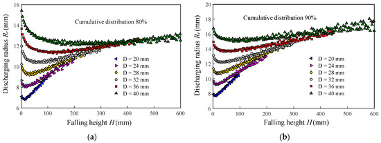 As previously established, distinct discharge ranges during grain outflow correspond to differentiated outflow characteristics. Therefore, to further investigate the variations in falling velocity and attitude associated with grain breakage during discharge processes, separate analyses should be conducted for these parameters across distinct discharge ranges. It should be noted that even discharged grains with cumulative fractions below 90% may exhibit a discharging radius exceeding the orifice radius during descent, consequently resulting in collisions with the chute sidewalls. In this study, the cumulative fraction serves as the criterion for delineating discharge ranges with distinct outflow characteristics. As shown in Figure 7, the 90% cumulative fraction represents the core layer where grains exhibit contracting flow, while the 99% fraction corresponds to the boundary layer with divergent flow. Accordingly, in the following study, 90% of the cumulative distribution of falling radius at different falling heights is taken as the representative discharging range of discharging core layer, and 99% of the cumulative distribution is taken as the representative discharging range of the discharging boundary layer.