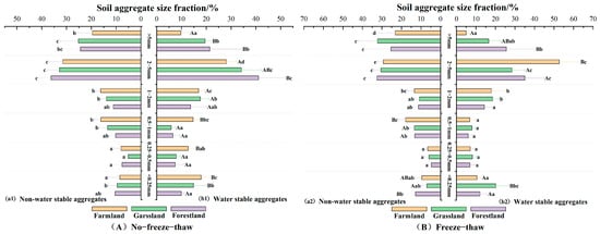 For WS aggregates, significant differences were detected among land use types for the >5 mm, 2–5 mm, and <0.25 mm size fractions (p < 0.05), with additional significant variations across aggregate size (p < 0.05). The 2–5 mm size fraction accounted for the highest proportion of WS aggregates, with mass fractions ranging from 28.46% to 52.71%. Relative to the pre-freeze–thaw period, farmland exhibited an 87.82% increase in the 2–5 mm WS aggregate fraction and a 41.82% decrease in the <0.25 mm fraction—a pattern contrasting with the pre- to post-FTC changes observed in NWS aggregates. Following FTCs, an increase in macroaggregates coincided with a decrease in microaggregates in farmland soils. In contrast, grassland displayed the opposite trend: following FTCs, the mass fraction of macroaggregates decreased while that of microaggregates increased. This suggests that FTCs fragmented macroaggregates and promoted the formation of microaggregates in grassland soils.