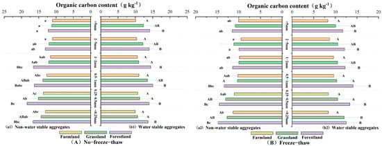 The SOC contents exhibited a reduction across all particle size fractions and land use types after freeze–thaw, with reduction rates ranging from 9.00 to 21.05% (farmland), 3.89–25.61% (grassland), and 4.75–30.88% (forestland). Notably, the magnitude of SOC reduction was more pronounced in non-water-stable (NWS) aggregates than in water-stable (WS) aggregates. These findings indicate that FTCs facilitate the release of SOC, with a more pronounced effect on NWS aggregates.