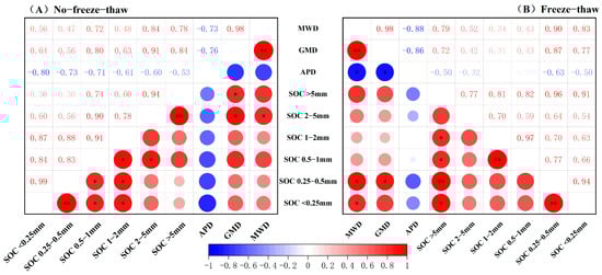 The correlation between soil aggregate stability and SOC under no-freeze–thaw conditions is shown in Figure 6A. Correlations were assessed across the entire dataset. Across all particle size fractions, SOC exhibited positive correlations with both MWD and GMD and negative correlations with APD. Notably, SOC in the >5 mm aggregate size fraction displayed a significant positive correlation with GMD (p < 0.05), while SOC in the 2–5 mm size fraction exhibited significant positive correlations with both MWD and GMD (p < 0.05).