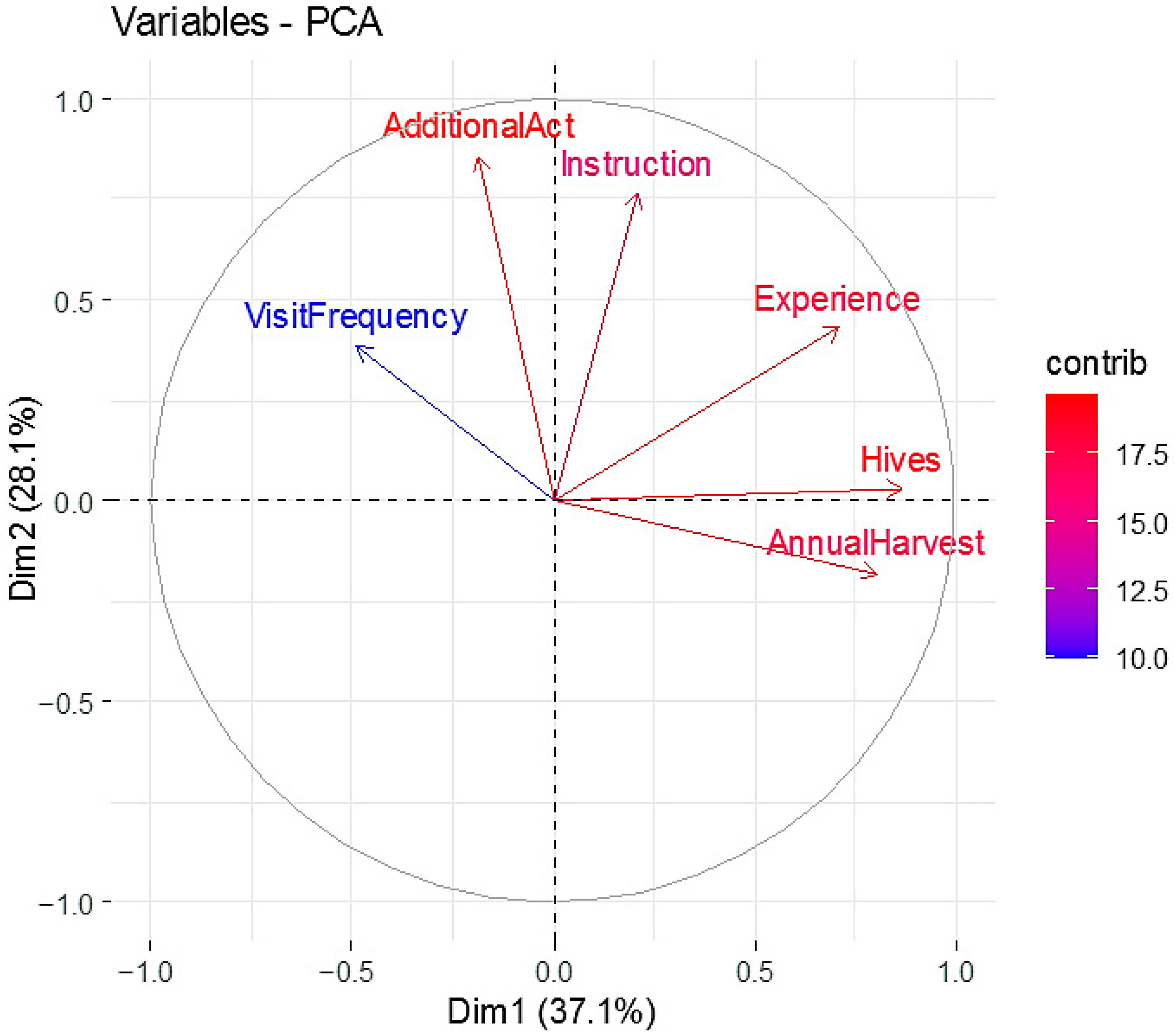 In contrast, apiary visit frequency was associated with a distinct third component, emerging as a relevant variable that may reflect its transversal role across both technical management and beekeeper profile dimensions [