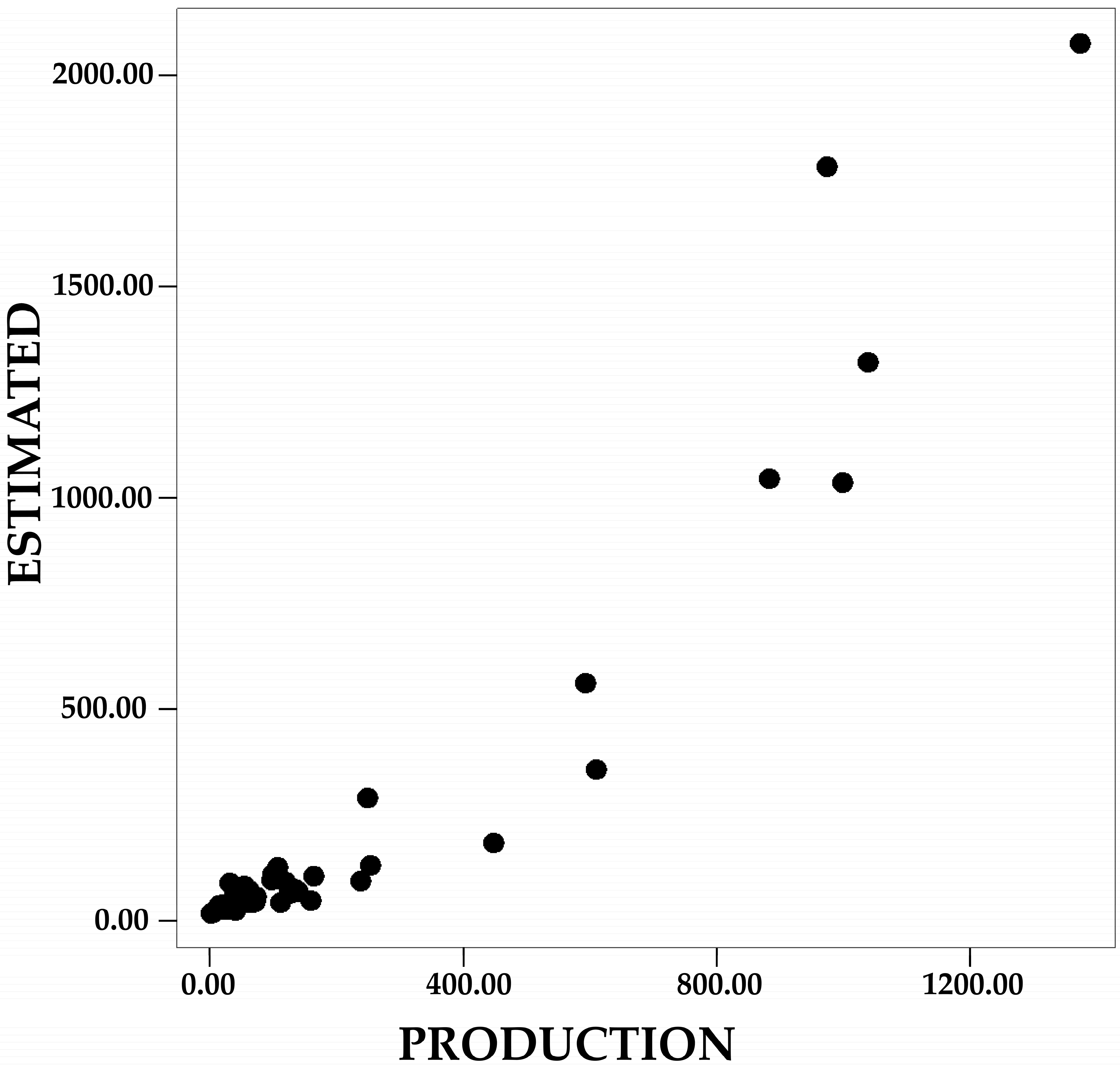 2 = 0.789) coefficients of determination indicated high explanatory power for both fixed and random effects, which is essential in mixed models incorporating unit-level heterogeneity (i.e., apiaries). Logarithmic transformation of the dependent variable during modeling, followed by back-transformation via the exponential function (exp()), improved data distribution and stabilized variance, yielding a more accurate fit. This precision was reflected in the strong correlation between predicted and observed honey yields (R = 0.836,