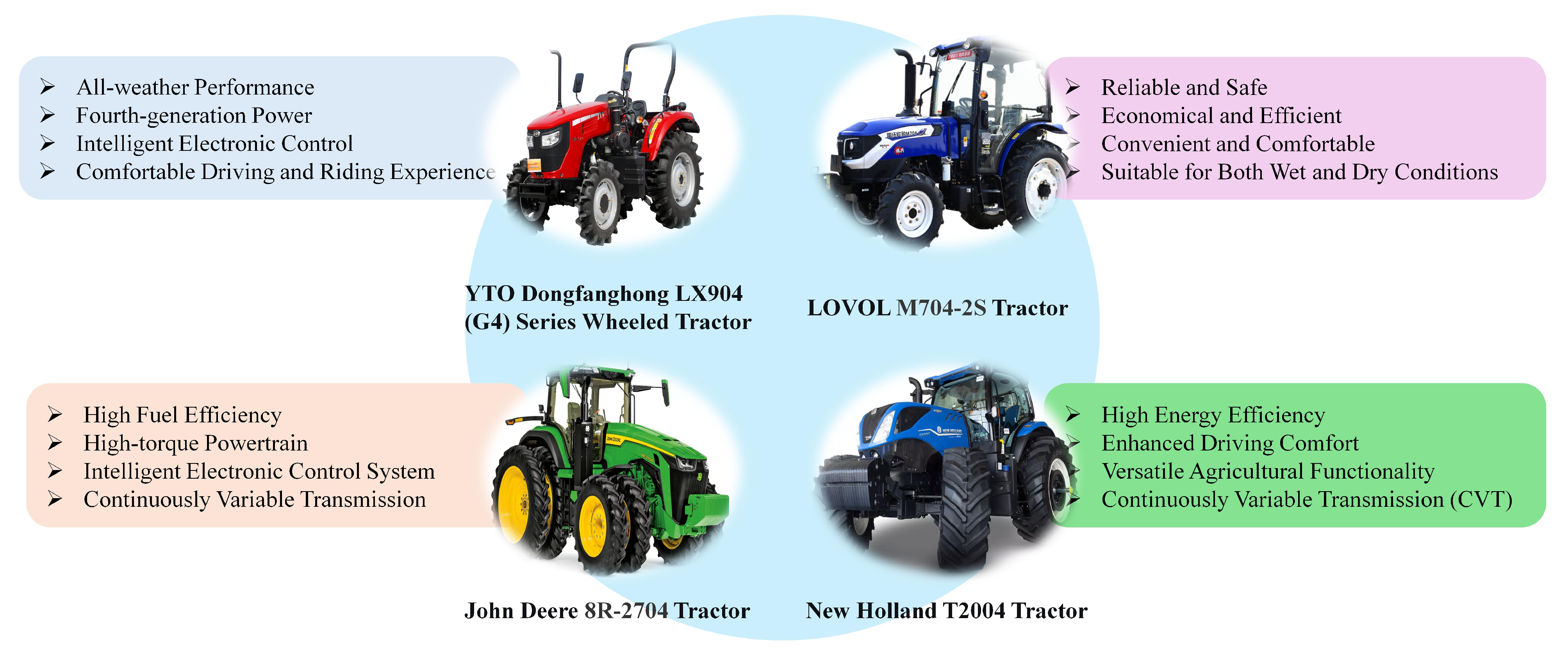 | Representative Models | ![]() John Deere 8R-2304 Tractor | ![]() AgBot 5.115T2 Agricultural Robot | ![]() DEEP Robotics Shanmao |