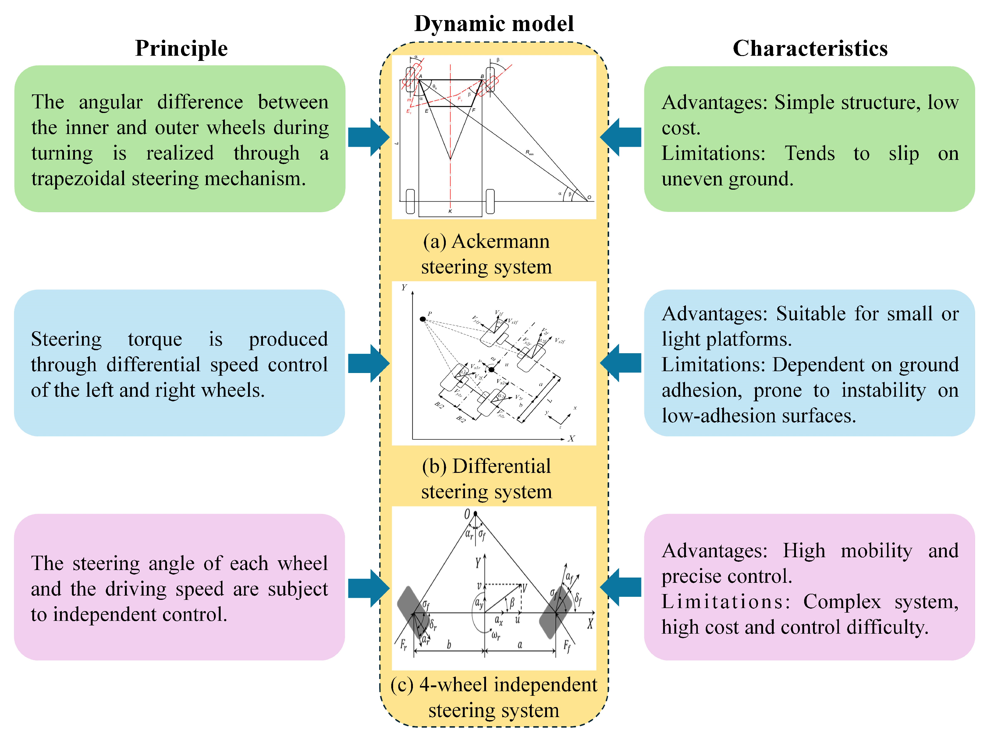 | Mechanical Complexity | Low: Rigid linkage mechanism | Medium: Requires independent drives or decoupling mechanisms | High: Independent steering actuator required for each wheel |