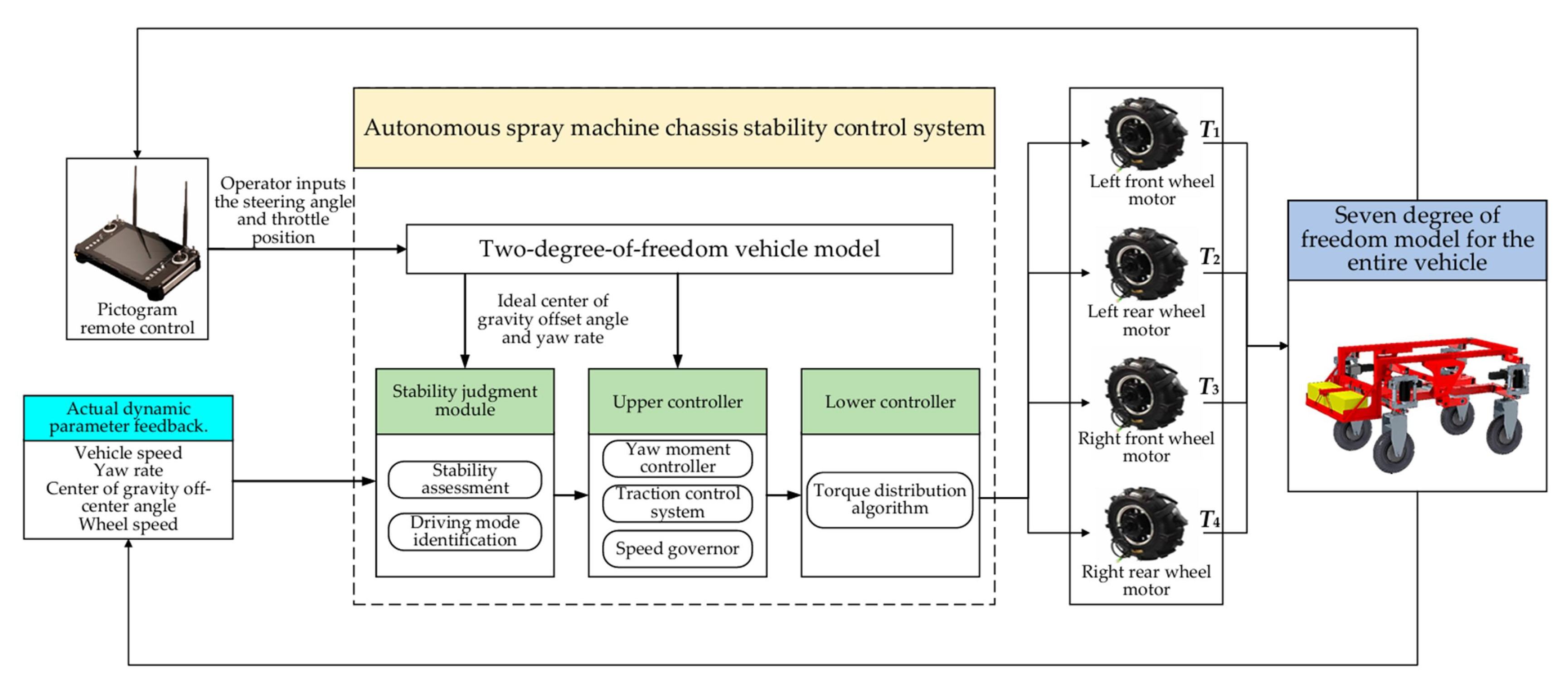- Liu, H.; Yan, S.; Shen, Y.; Li, C.; Zhang, Y.; Hussain, F. Model Predictive Control System Based on Direct Yaw Moment Control for 4WID Self-Steering Agriculture Vehicle. Int. J. Agric. Biol. Eng. 2021, 14, 175–181. [Google Scholar] [CrossRef]