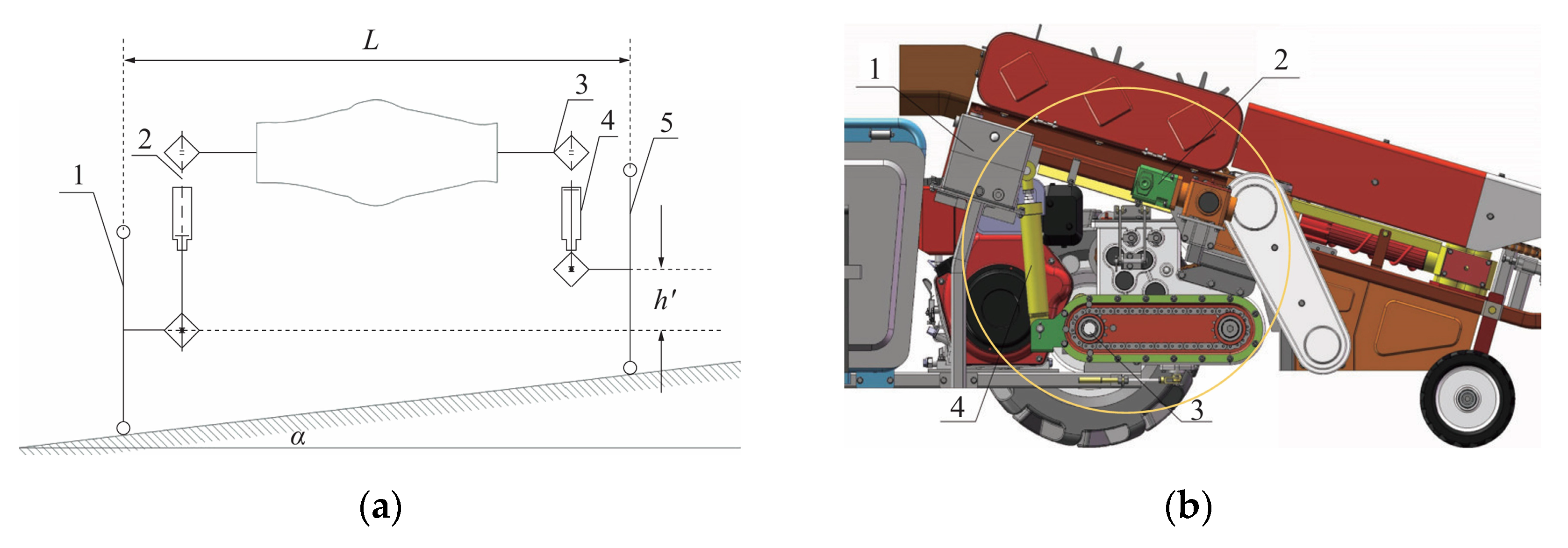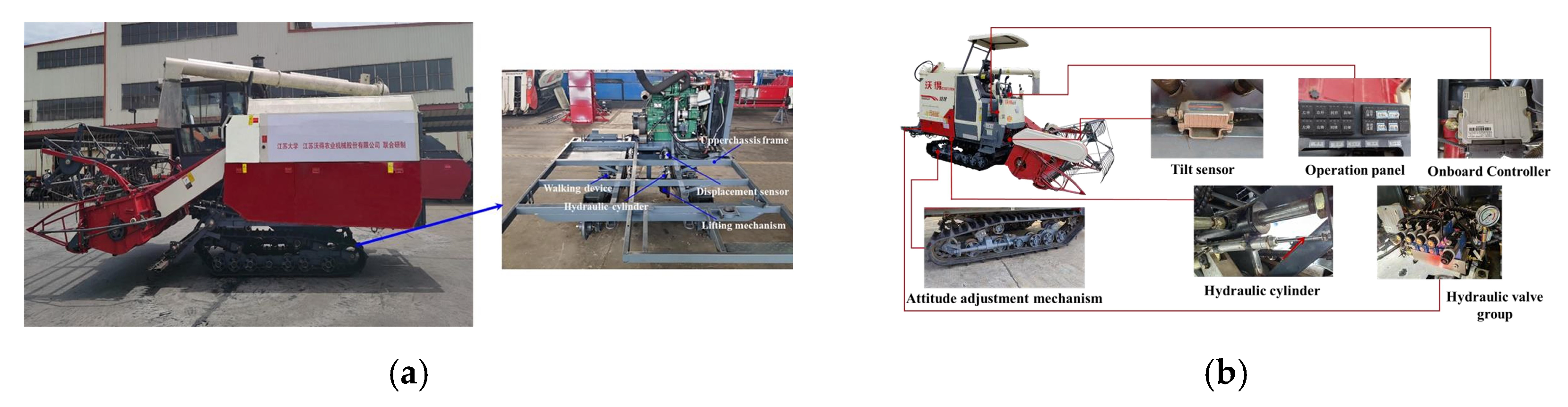 - Hu, J.; Pan, J.; Dai, B.; Chai, X.; Sun, Y.; Xu, L. Development of an Attitude Adjustment Crawler Chassis for Combine Harvester and Experiment of Adaptive Leveling System. Agronomy 2022, 12, 717. [Google Scholar] [CrossRef]