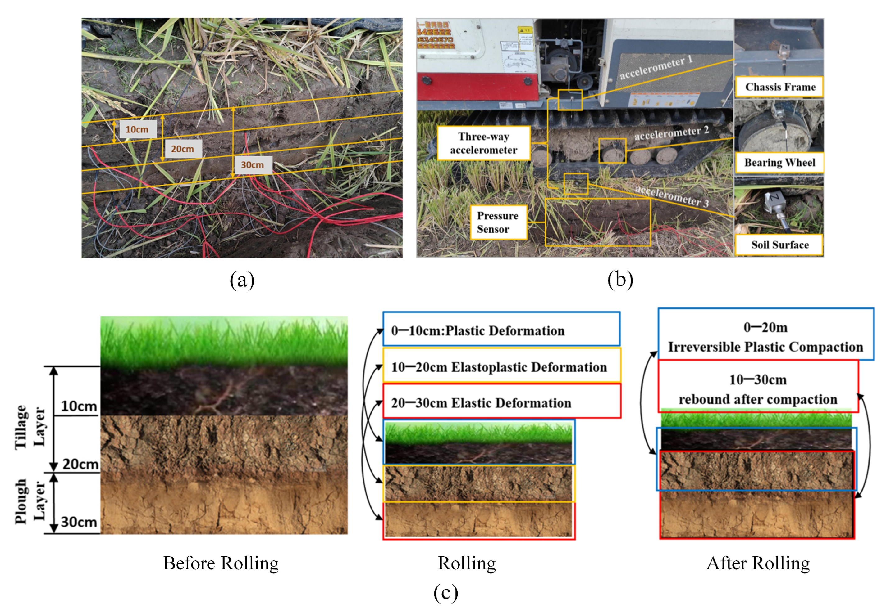 - Jing, T.; Tang, Z.; Ding, Z.; Liang, Y.; Fang, M.; Wang, T. Paddy Soil Compaction Effect Undergoing Multi-Dimensional Dynamic Load of Combine Harvester Crawler. Agriculture 2024, 14, 202. [Google Scholar] [CrossRef]
