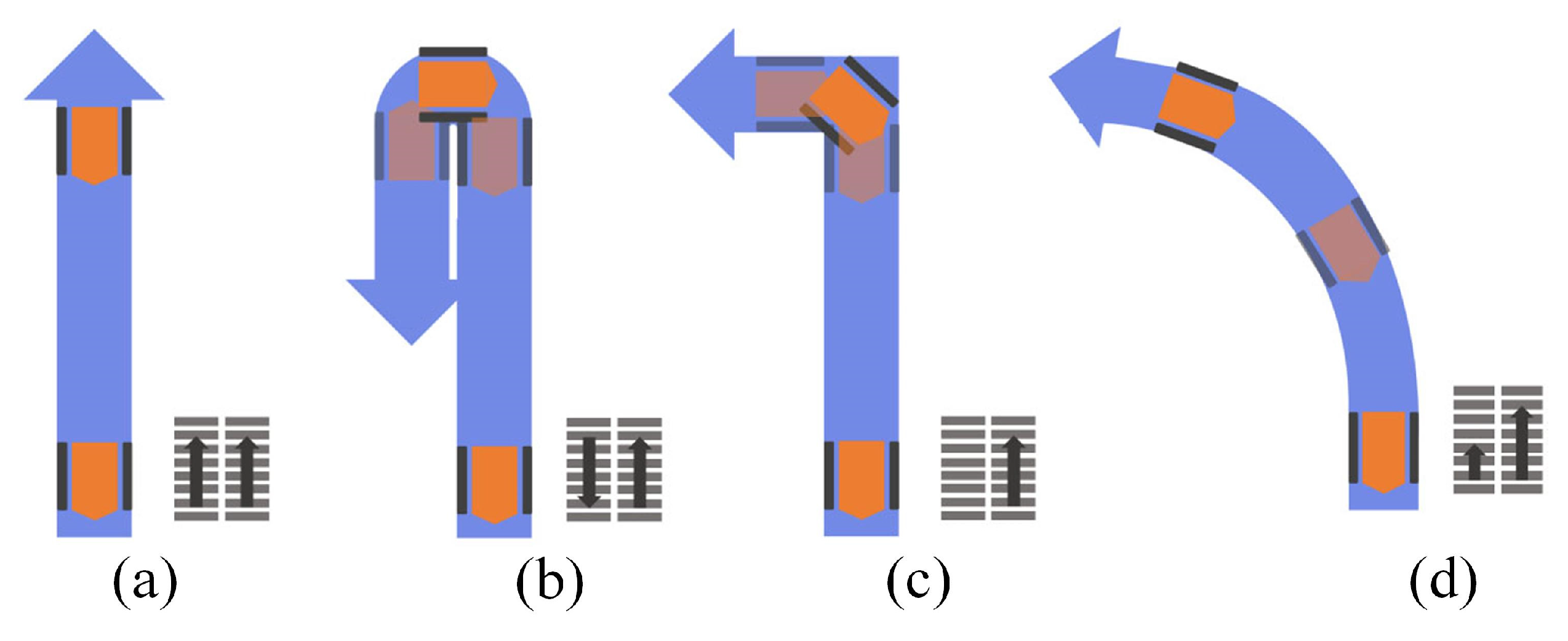 | Steering Maneuverability | Large turning radius | Zero-radius steering | Zero-radius steering, crabwise locomotion |
