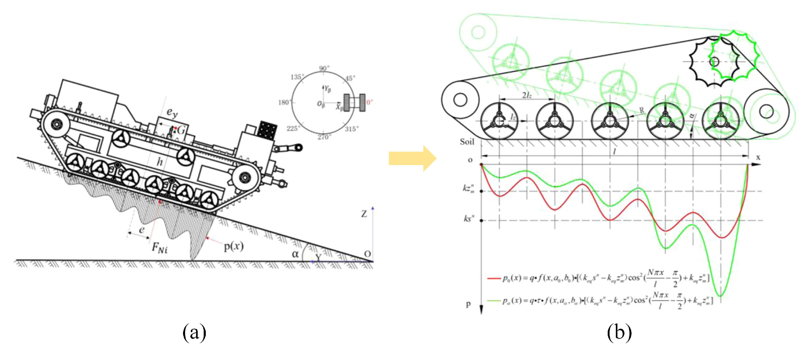 - Guan, Z.; Li, H.; Jiang, T.; Xing, L.; Zhang, M.; Jiang, D.; Jin, M. Effect of Rubber-Tracked Chassis Roller on Soil Surface Vertical Stress Distribution Based on Finite Element Method. J. Terramech. 2025, 120, 101080. [Google Scholar] [CrossRef]