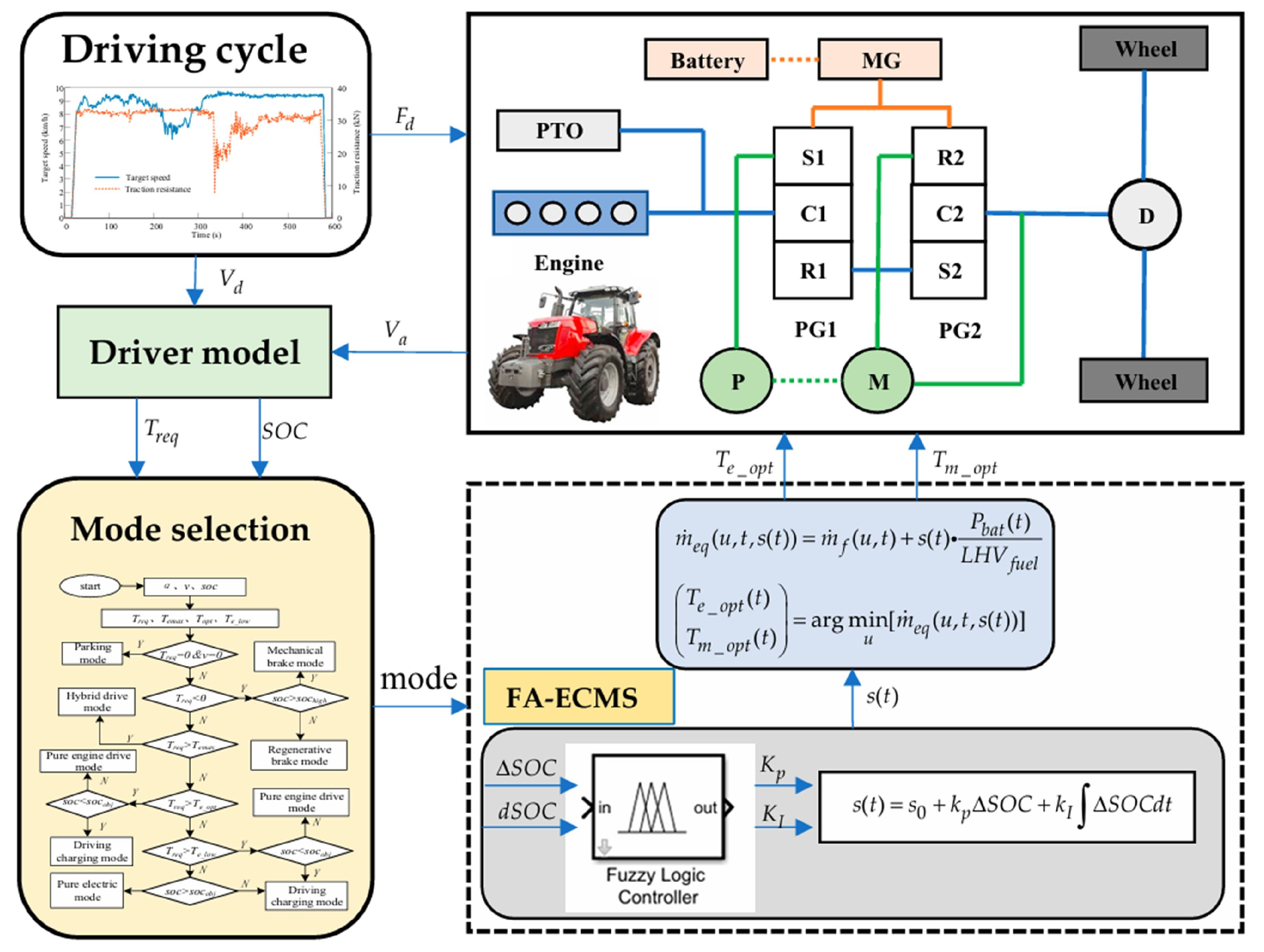 - Zhu, Z.; Zeng, L.; Chen, L.; Zou, R.; Cai, Y. Fuzzy Adaptive Energy Management Strategy for a Hybrid Agricultural Tractor Equipped with HMCVT. Agriculture 2022, 12, 1986. [Google Scholar] [CrossRef]