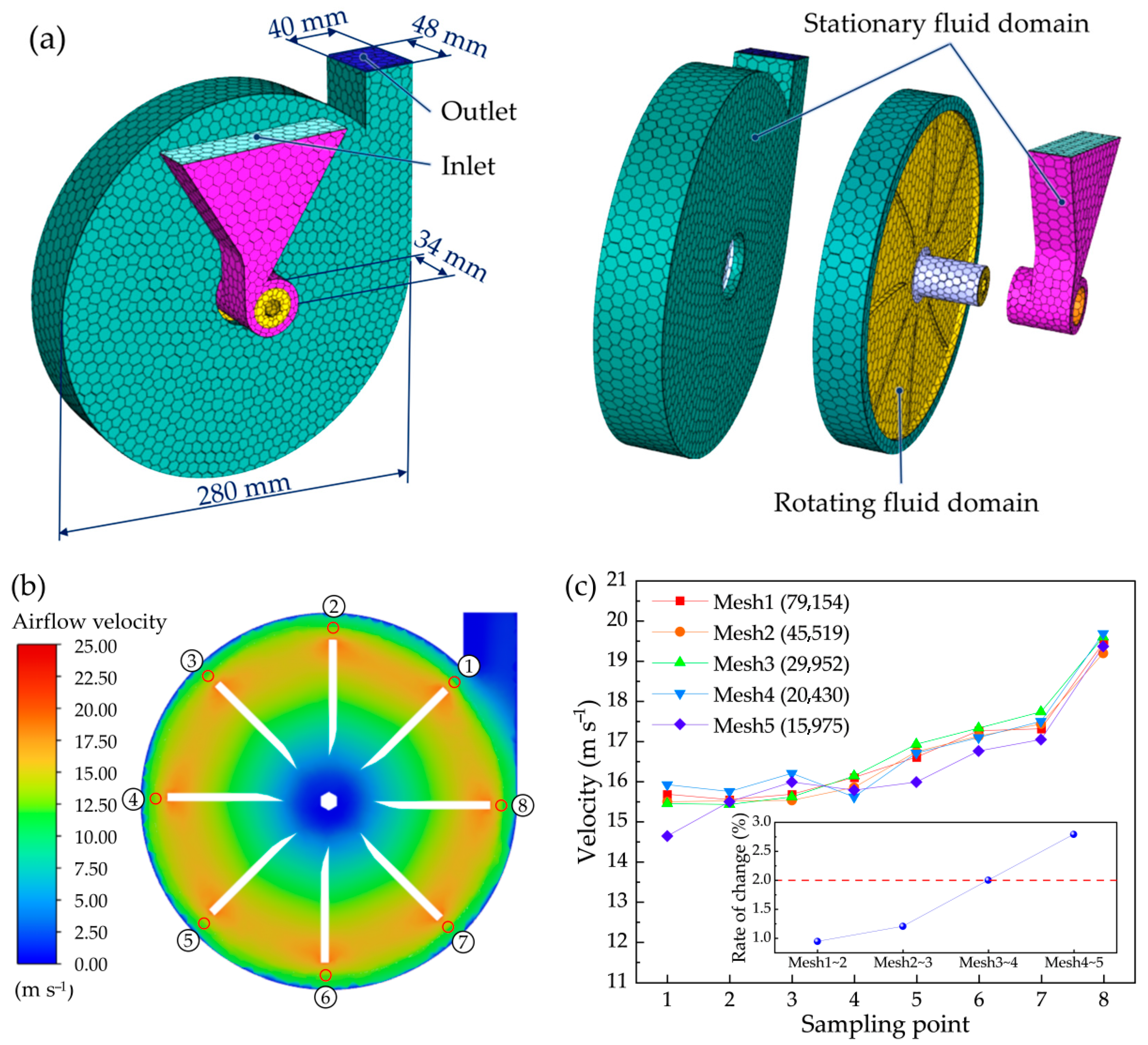 - Liang, Z.; Wada, M.E. Parameter optimisation of a centrifugal fan for rice combine harvesters based on airflow resistance coefficients and CFD simulations. Biosyst. Eng. 2025, 259, 104287. [Google Scholar] [CrossRef]