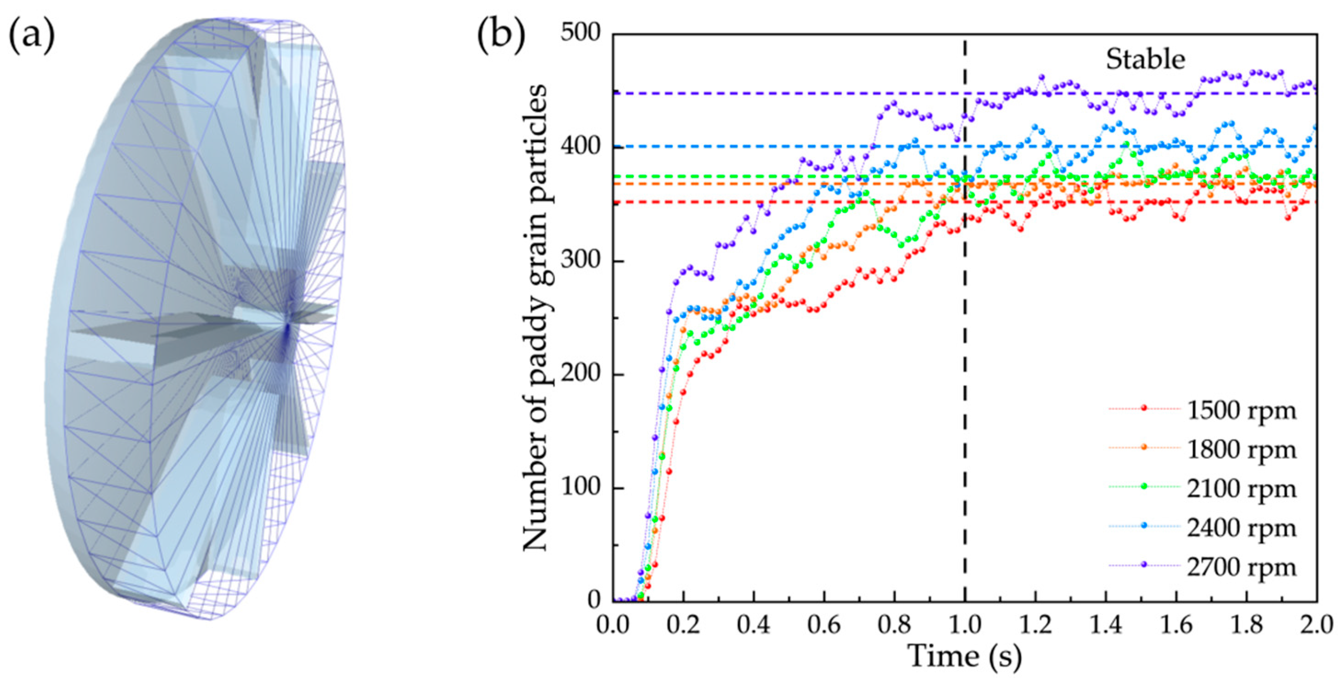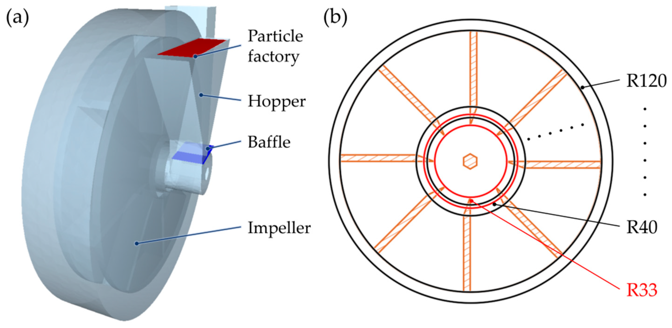 - Li, A.; Jia, F.; Chu, Y.; Han, Y.; Li, H.; Sun, Z.; Ji, S.; Li, Z. Simulation of the movement of rice grains in a centrifugal huller by discrete element method and the influence of blade shape. Biosyst. Eng. 2023, 236, 54–70. [Google Scholar] [CrossRef]