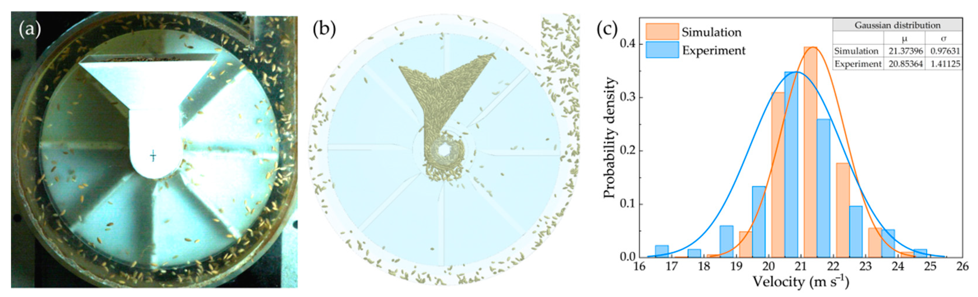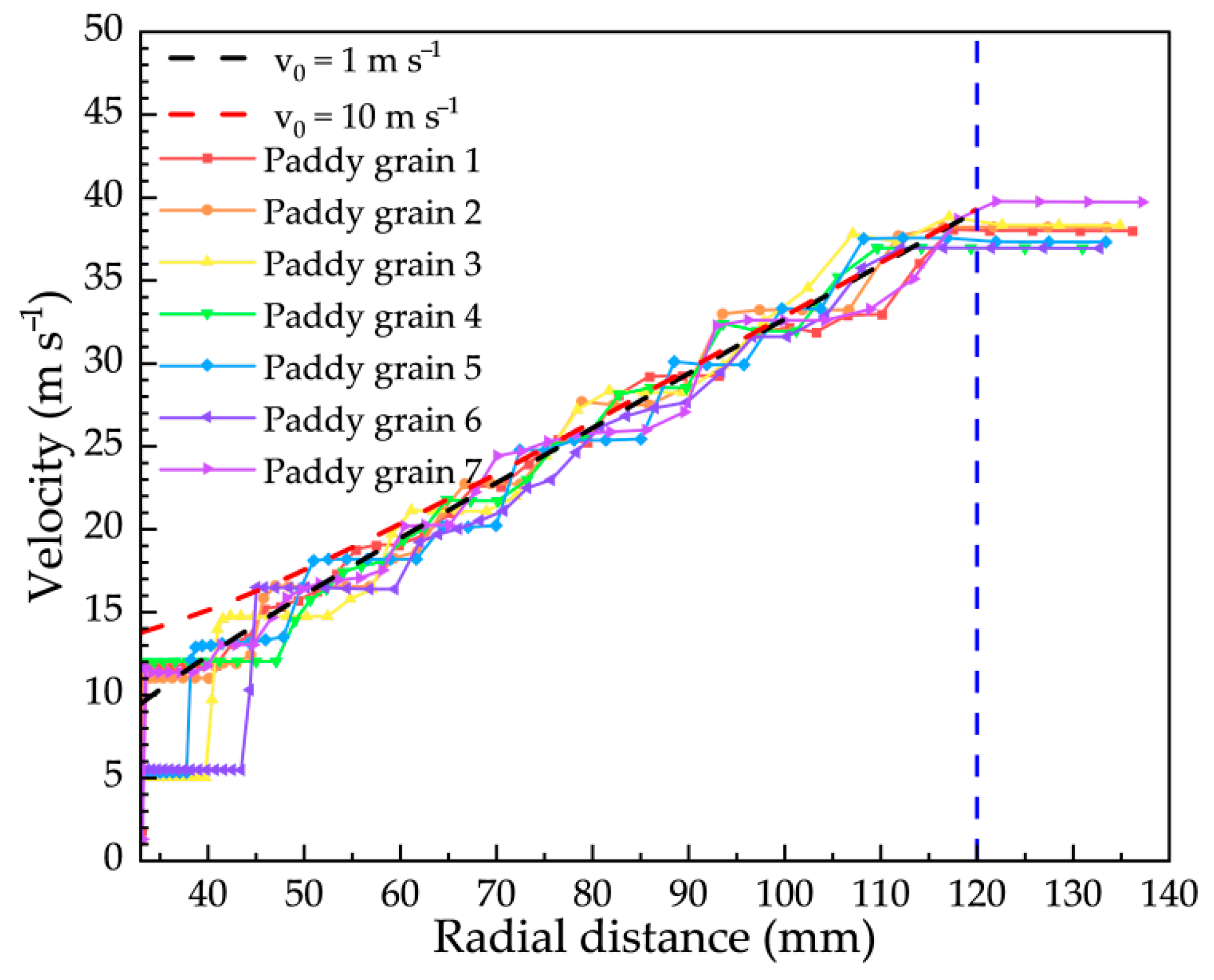 - The velocity of the paddy grain population increased with radial distance, with velocity differences initially decreasing and then increasing. The velocity distribution of the paddy grain population initially exhibited a bimodal distribution due to varying axial collision positions. Following the transition to a unimodal distribution, velocity differences gradually increased due to system instability and particle characteristics. Notably, the strong airflow generated by the impeller was identified as one of the contributing factors to increased velocity differences.
