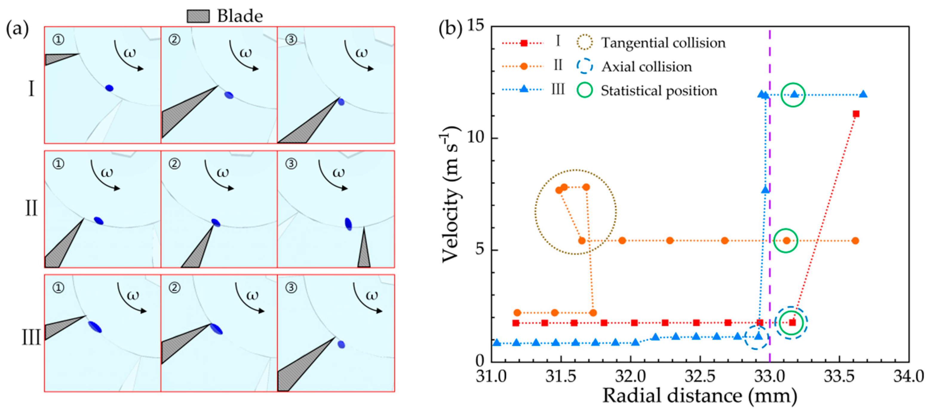 - The different forms of collision between the paddy grains and the blades during the feeding stage were identified as the primary cause of the velocity differences, with tangential collisions playing a dominant role. These differences increased with higher impeller speeds.