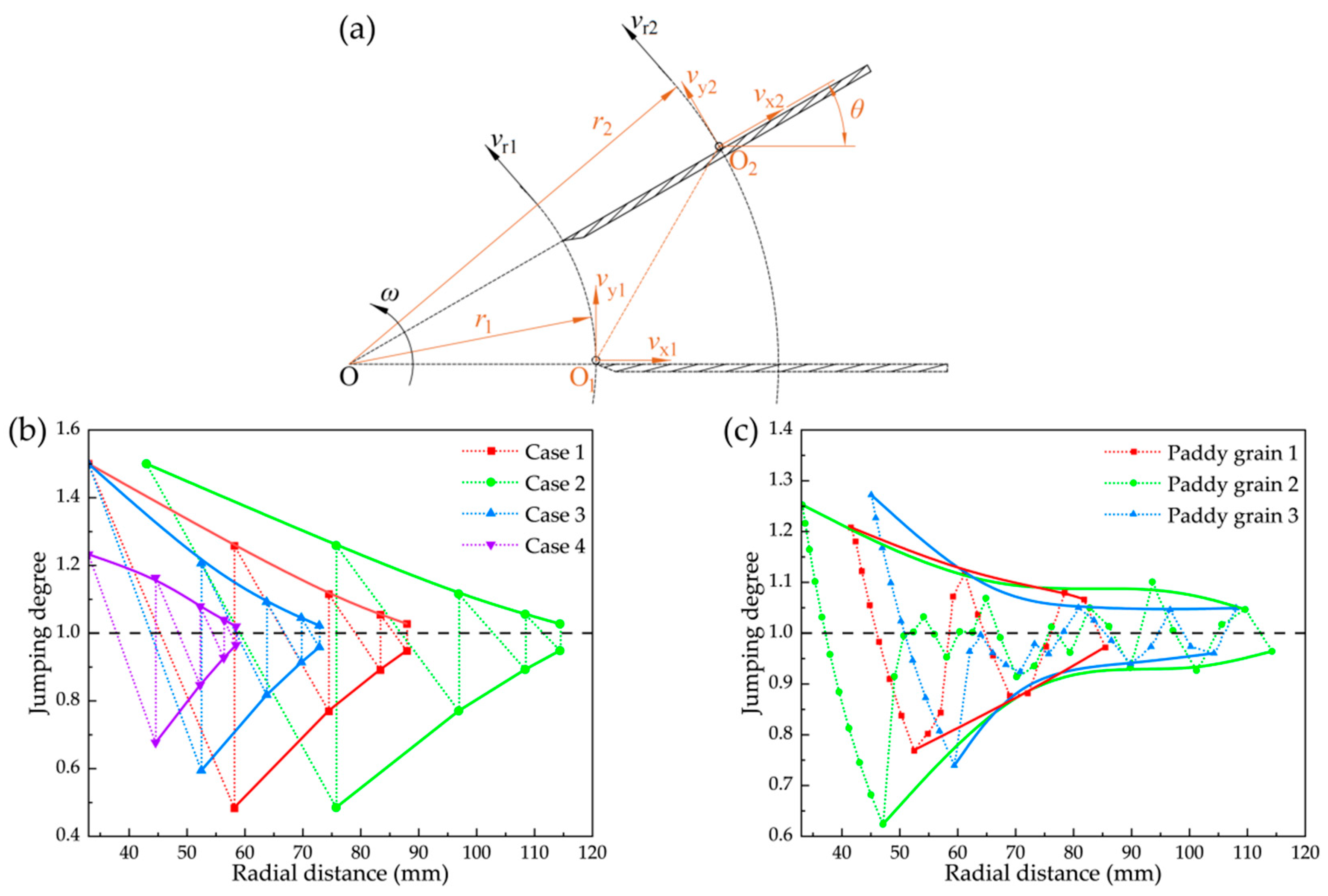 - Axial collisions between paddy grains and blades during the accelerating stage were identified as the primary cause of velocity differences. The jumping degree (Sv) parameter was demonstrated to effectively quantify the relative motion of paddy grains to the blades. Increasing the initial velocity of the paddy grains and reducing the radial distance of the initial collision facilitated the convergence of the jumping degree towards unity, thereby reducing velocity differences.