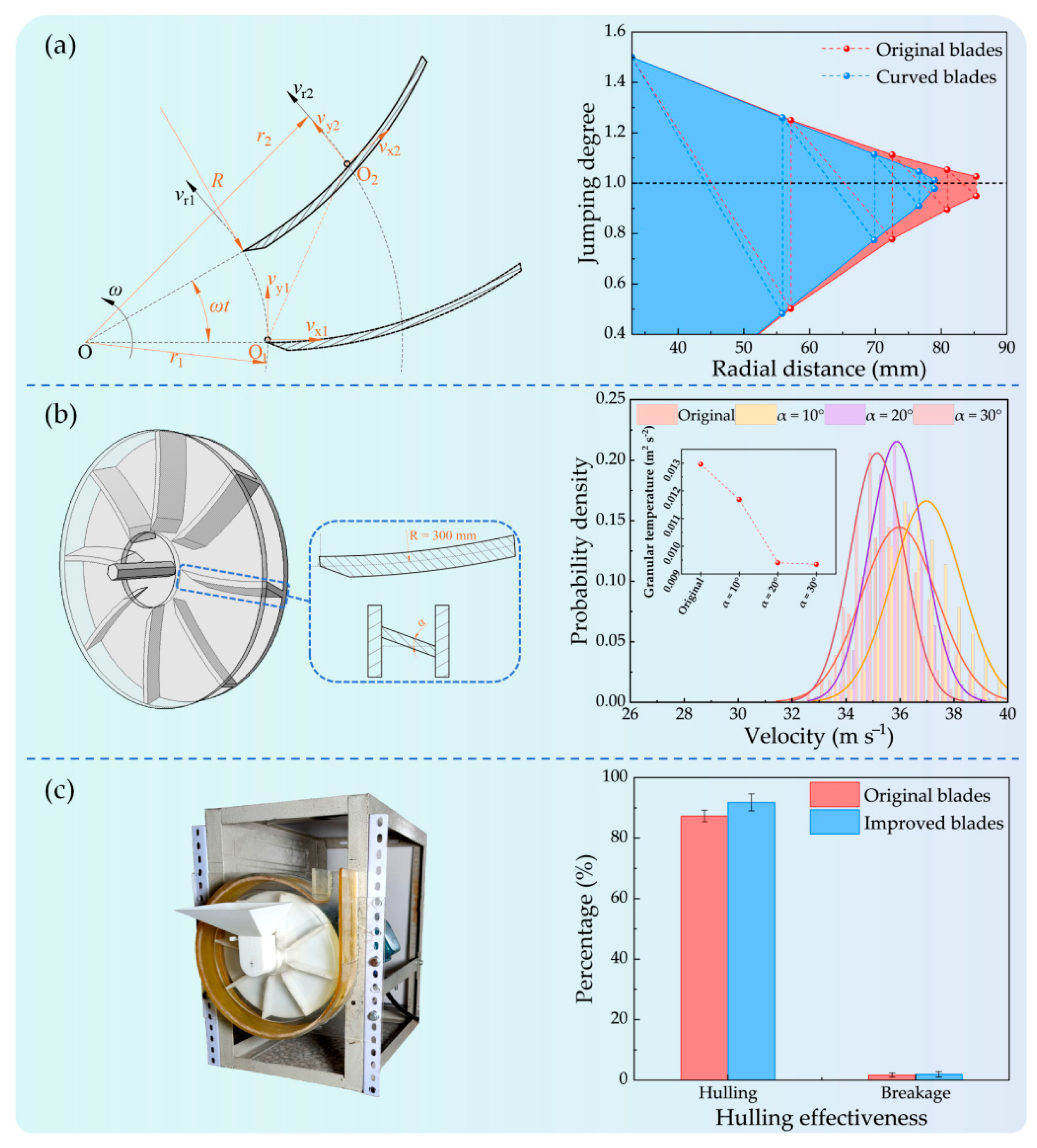 - A tilted curvature blade design was developed to minimise velocity differences among paddy grains. The results demonstrate that the configuration with a 300 mm radius of curvature and 20° tilt angle achieves a 27.5% reduction in velocity differences. Experimental verification confirmed that this optimised design improves hulling efficiency by 4.5%. This enhancement holds significant practical implications for agricultural processing operations.