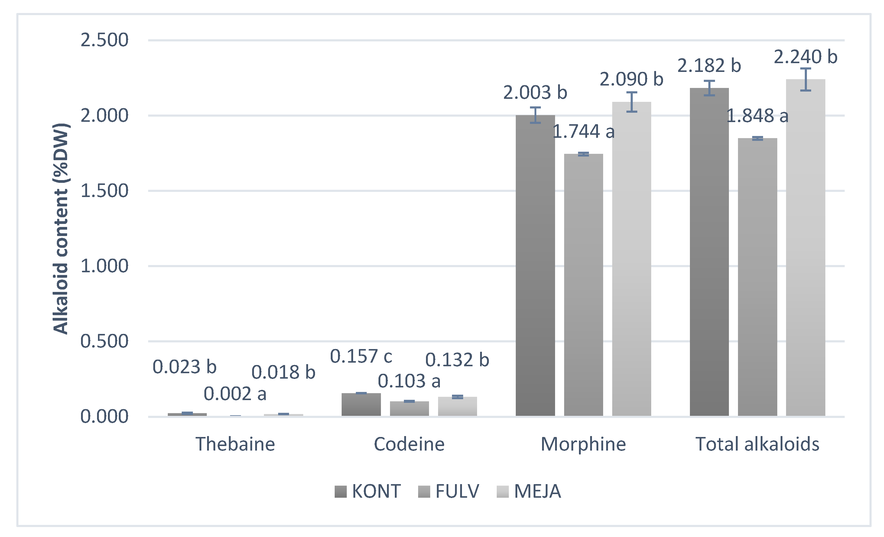 Changes were also observed in the accumulation level and composition of alkaloids. In the control samples, the concentration of the major alkaloid morphine was 2.003%, while the minor alkaloids, codeine and thebaine, were present in lower concentrations (0.157 and 0.023%, respectively), resulting in a total alkaloid level of 2.182%. In the MEJA treatment samples, codeine content was 0.132%, significantly lower than the control (p < 0.001). However, the morphine (2.090%), thebaine (0.018%), and total alkaloid concentrations (2.240%) were similar to the control. As a result of the higher capsule yield and unchanged alkaloid concentrations, the alkaloid yield, calculated as the product of these two characteristics, was increased by MEJA treatment. In contrast, FULV treatment resulted in a significantly lower (p < 0.001) accumulation of all alkaloids (Figure 1), and because of that, in spite of higher capsule yields, it could not ensure a significantly higher yield of alkaloids compared to the control.
