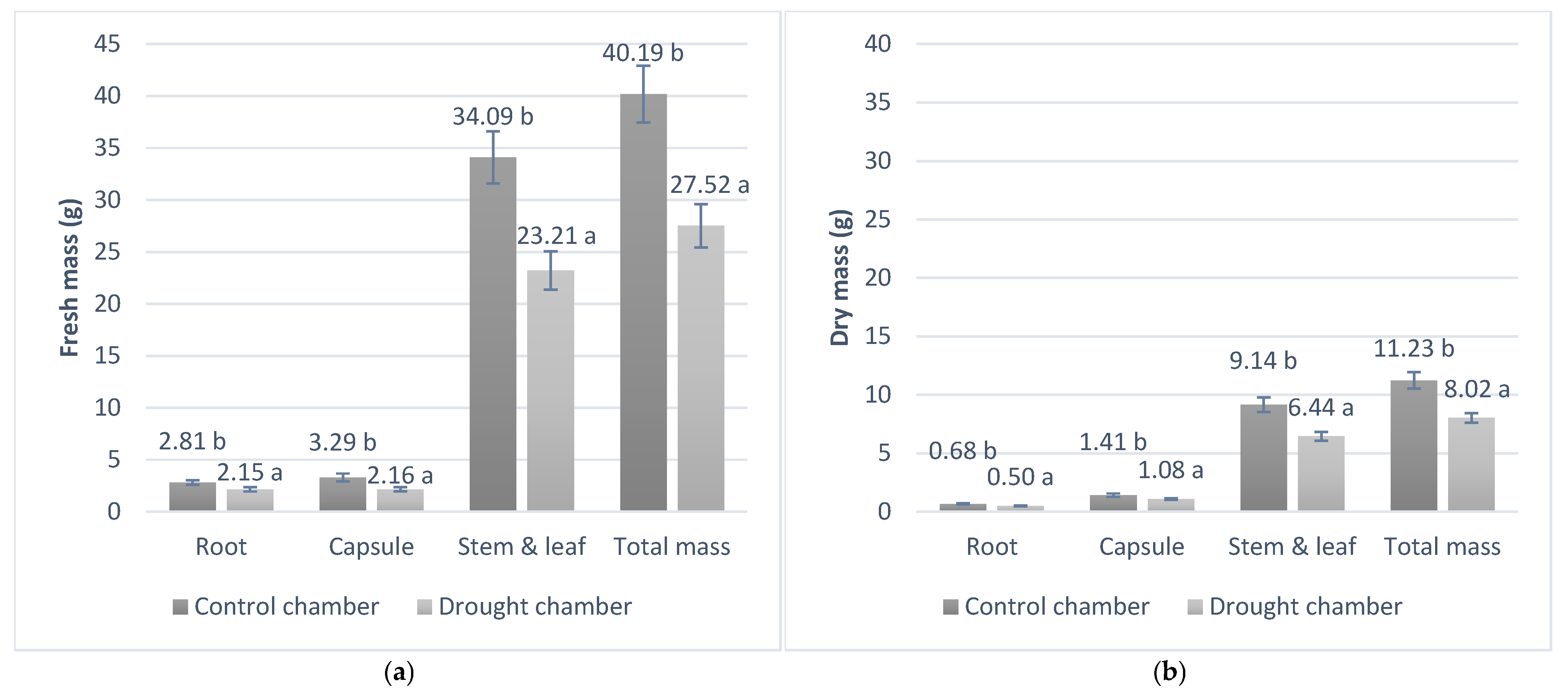 The total plant fresh weight under well-irrigated (control) conditions was 40.19 g/plant on average, while it was 27.52 g/plant under drought stress (Figure 2). Both the fresh and dry masses of all organs were significantly different due to the different water supply. However, their ratios remained practically unchanged. The proportion of stems and leaves within the green mass was 85% and almost the same, 84%, under well-irrigated and drought conditions, respectively. Similarly, the proportion of roots was 8% in the fresh mass and 6% in the dry mass under both water supply regimes. The proportion of capsule masses differed only in dry mass. There was a proportion of 8% fresh mass in both chambers, but the ratio of capsules in the total mass was more than double in the drought chamber if we calculate it from the dry mass (p < 0.005). These differences are related to the dry matter content of the plants: under control conditions, it was 43% at harvest, while under drought stress, it was 50%.