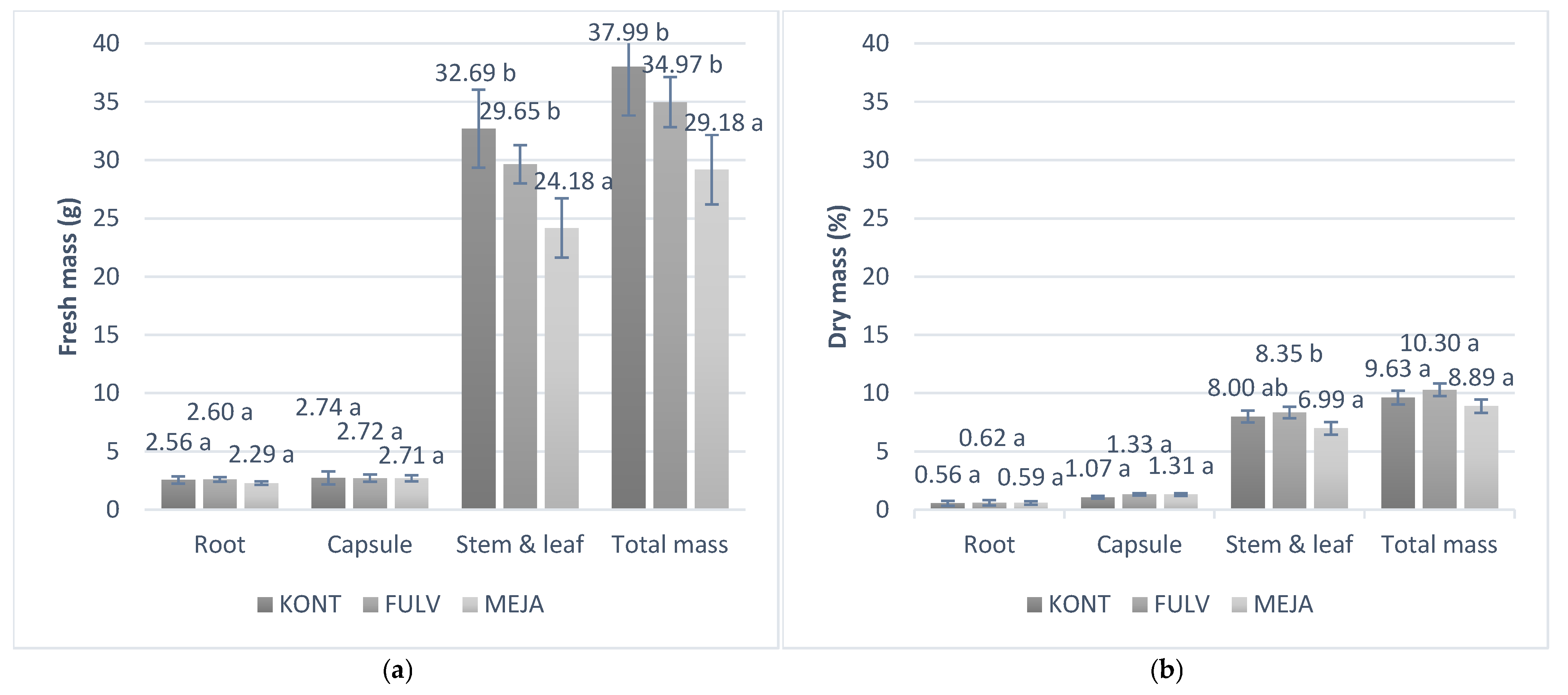 The total fresh weight followed the trend of stem and leaf: KONT and FULV plants significantly exceeded the MEJA treatment (p < 0.005). However, this difference disappears when examining the total dry weight, and the values of the groups (8.89–10.30 g/plant) become statistically equal. This difference is due to the different dry matter content of the plants. Data-based calculations show that the dry matter content of the total plant mass is 25.3% in the case of KONT plants, while that of the treated groups is higher, 29.5–30.5%. In the case of the capsules, this tendency is even more obvious: the fresh mass of the capsules was statistically different only at a lower probability level (p = 0.080) in the three groups (2.71–2.74 g/plant); however, the treatments had a significant effect (p < 0.005) on the dry matter content of the capsules. It was 39.1% in the KONT, 48.9% in the FULV treatment, and 48.3% in the case of MEJA capsules. Calculated from these, the treatments, especially MEJA, elevated the proportion of capsules in the total biomass (28% higher than KONT) and also in the dry, harvested plant mass (36% higher than KONT). It was also observed that the treatments resulted in a higher proportion of healthy capsules in the treated plants even under dry conditions, while in the case of the control, abnormal capsules also occurred due to stress (Figure A2).