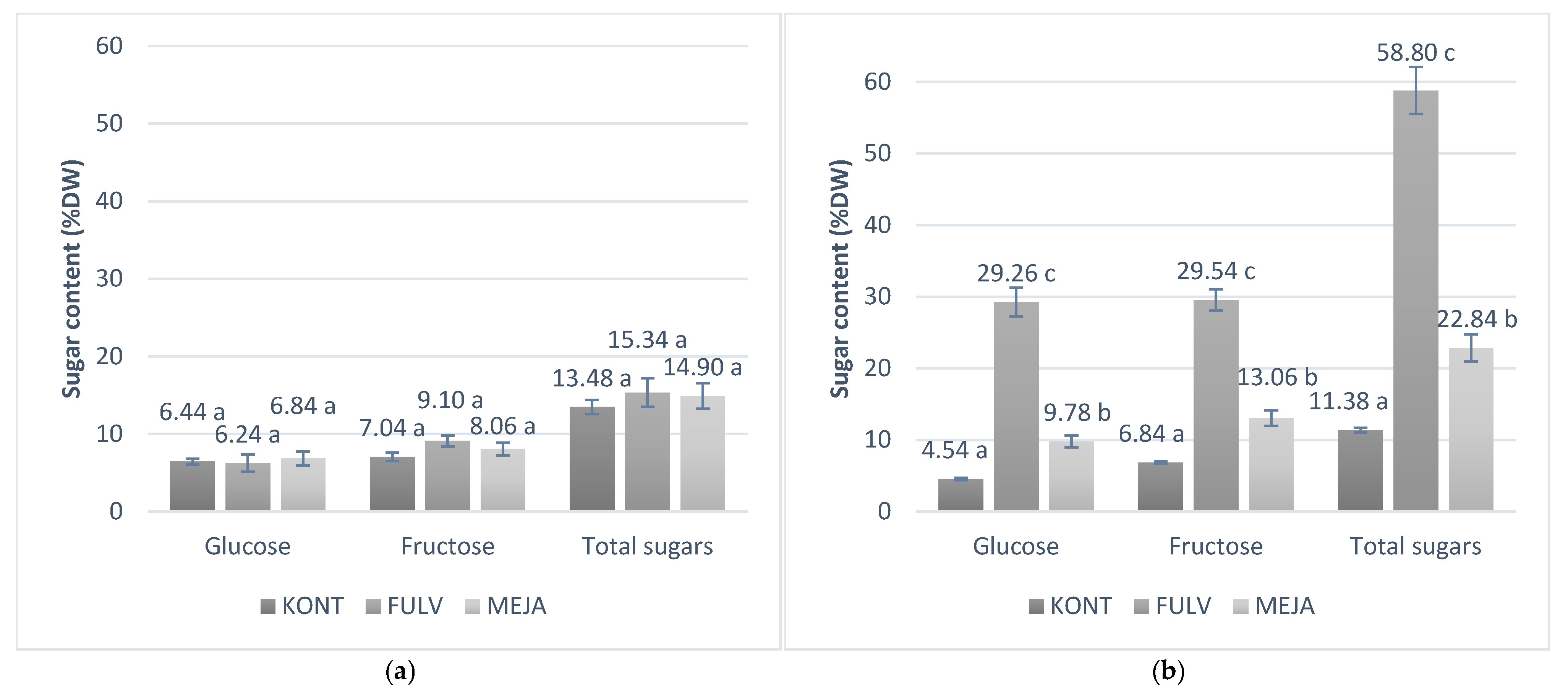 The accumulation of soluble sugars in the leaf samples was significantly (p < 0.001) influenced by water supply, biostimulants, and the interaction of these two factors. In the well-watered (control) chamber, there was no detectable difference in the sugar content of samples originating from the two biostimulant treatments. The accumulation of glucose was between 6.24 and 6.84 mg/g DW (p = 0.884), and that of the fructose between 7.04 and 9.10 mg/g DW (p = 0.184), so the total amount of these soluble sugars lay between 13.48 and 15.34 mg/g DW (p = 0.675) (Figure 4). Under dry conditions, however, the leaf samples of MEJA and FULV treatments resulted in significantly higher (p < 0.001) concentrations of the osmotically active monosaccharides. The control plants contained 4.54 mg/g DW glucose and 6.84 mg/DW fructose. The MEJA treatment elevated the glucose content by 115% and the fructose content by 90% while the FULV treatment showed extremely high values, an almost 6.5 fold increase for glucose and a 4.3 fold one for fructose (Figure 4).