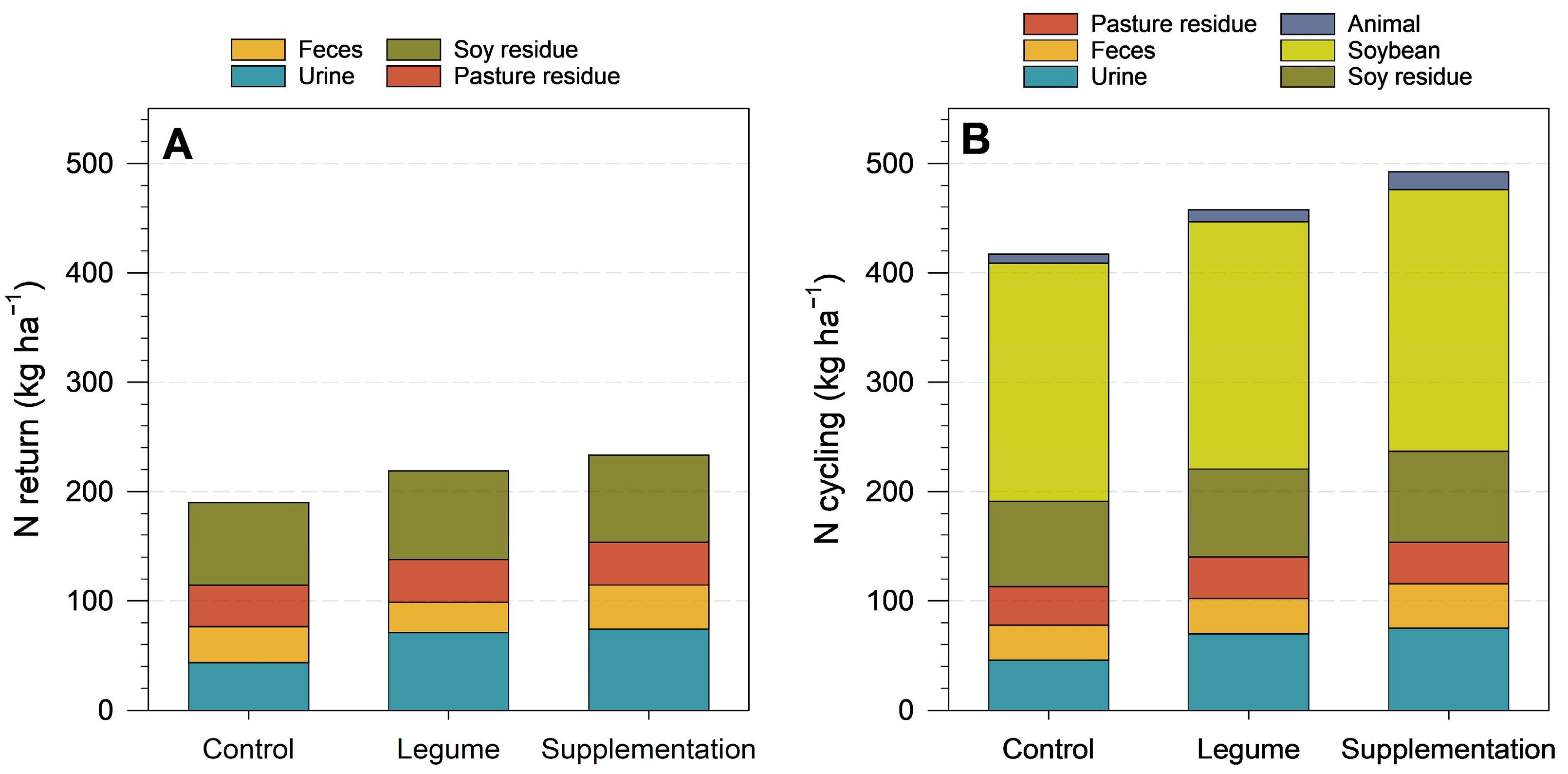 Figure 2. Total N return (A) and cycling (B) in an integrated crop-livestock system. Control: oats + ryegrass; Legume = oats + ryegrass + legume; Supplementation = oats + ryegrass + animal supplement.