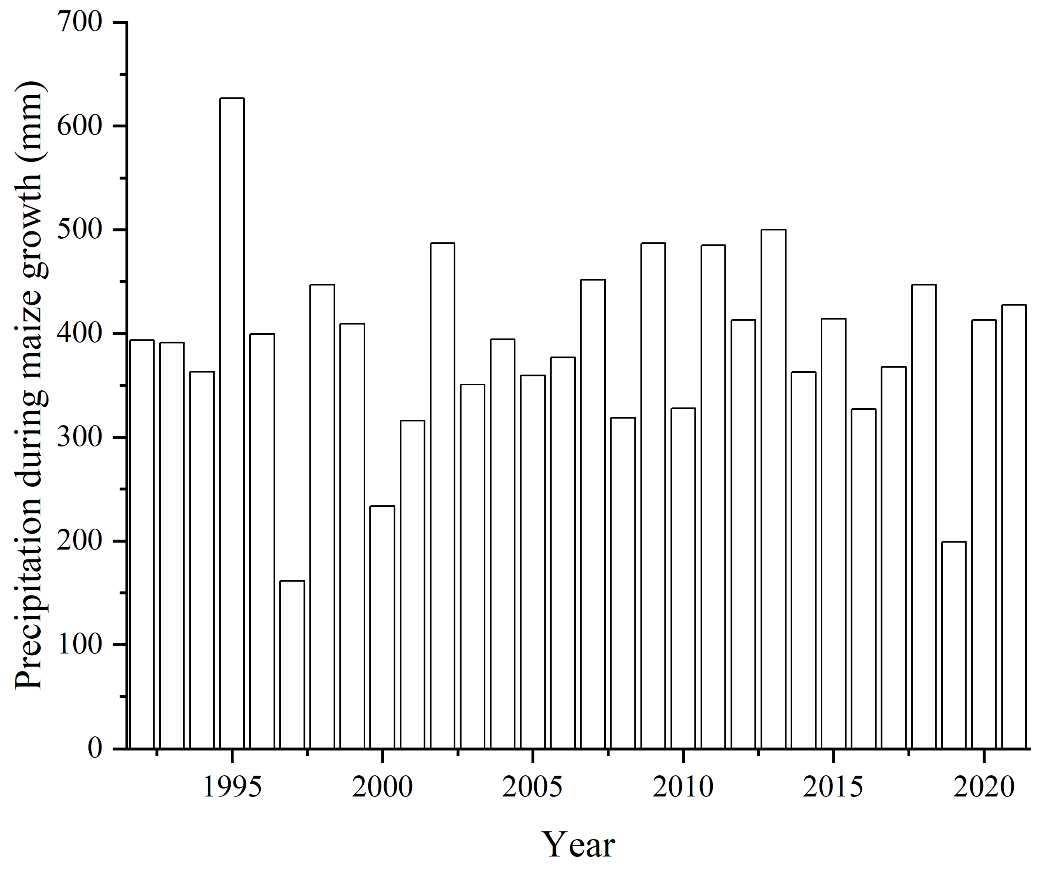 The experiment included 18 treatments, including three factors and four levels of nitrogen, phosphorus and cattle manure; a control without fertilizer; and a treatment with high amount of cattle manure. Experimental plots were established in a randomized arrangement. In this study, 9 treatments were selected for analysis: a control without fertilizer (N0P0M0), four levels of chemical fertilizer alone (N1P1M0, N2P2M0, N3P3M0, N4P4M0), three combinations of chemical fertilizer and cattle manure (N2P1M1, N3P2M3, N4P2M2), and a high cattle manure level (N0P0M6). The specific amounts of fertilizer and manure are shown in Table 2. Urea (46% N) was used as the nitrogen fertilizer, while superphosphate (16% P2O5) served as the phosphorus source. The cattle manure was fully decomposed and contained 90.5–127.3 g·kg−1 of organic matter, 3.93–4.97 g·kg−1 of total nitrogen, 1.37–1.46 g·kg−1 of total phosphorus, and 14.1–34.3 g·kg−1 of total potassium. Each treatment had three replicate plots of 66.7 m2. The planting density was 45,000–52,000 plants ha−1 from 1992 to 2011, and 66,000 plants ha−1 from 2012 to 2021. The planting time was from 15 April to 30 April, and the harvest time was from 20 September to 10 October. During the experimental period, precipitation data were collected using a rain gauge positioned within the experimental field. The precipitation during maize growth (May–September) from 1992 to 2021 is shown in Figure 1.